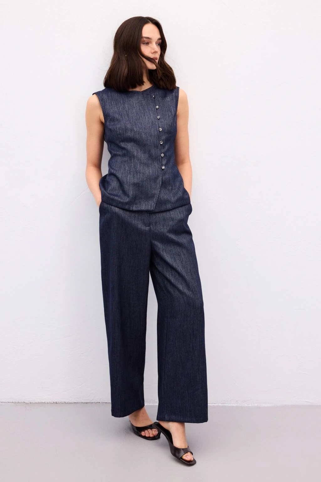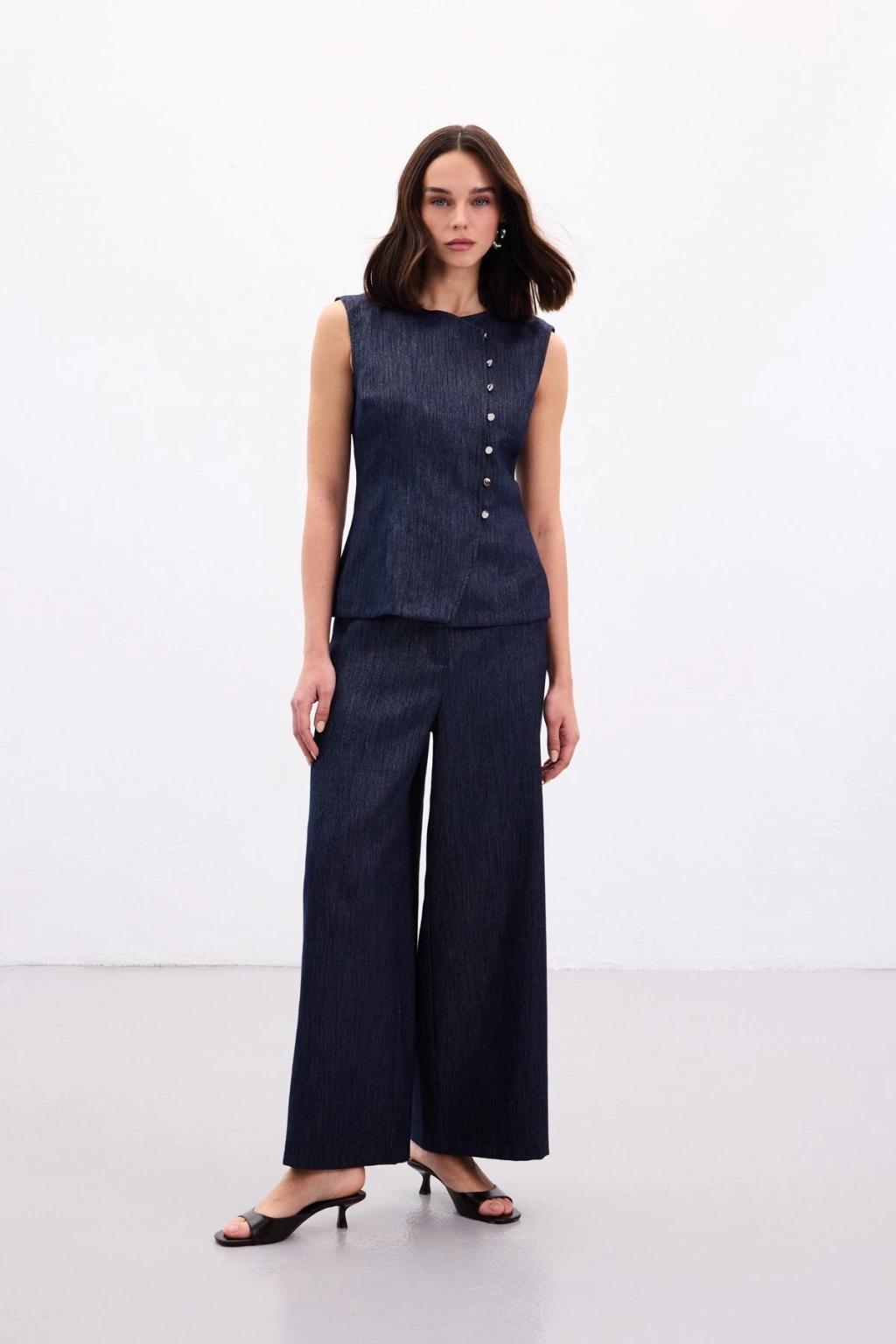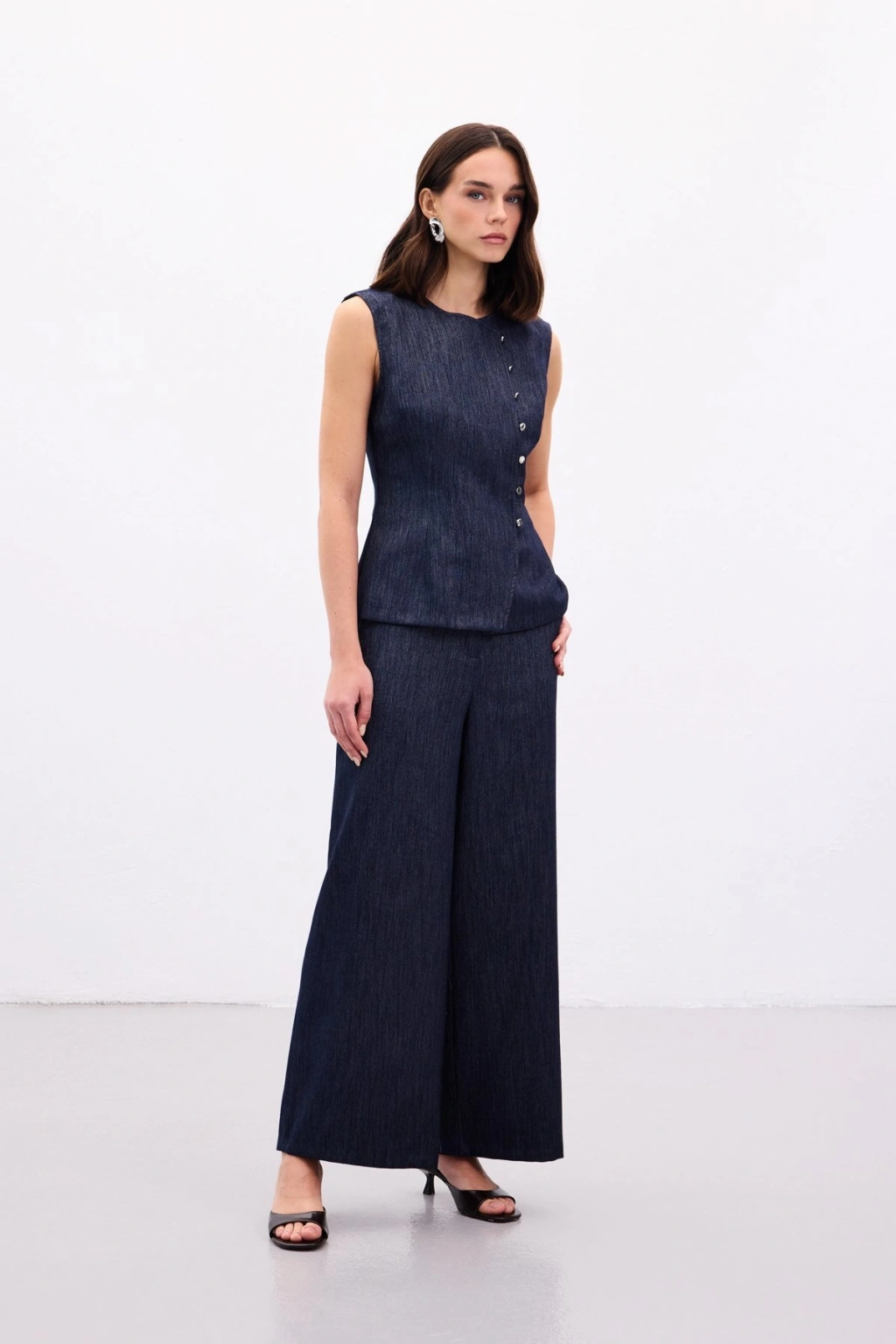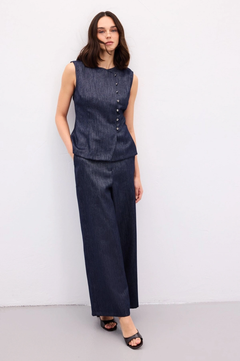 Pileli Saten Krep Pantolon - İndigo