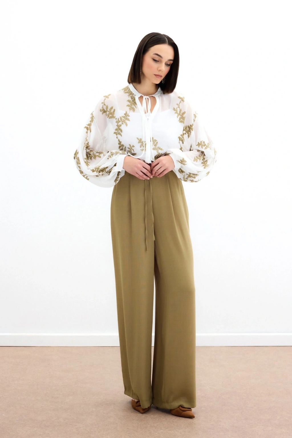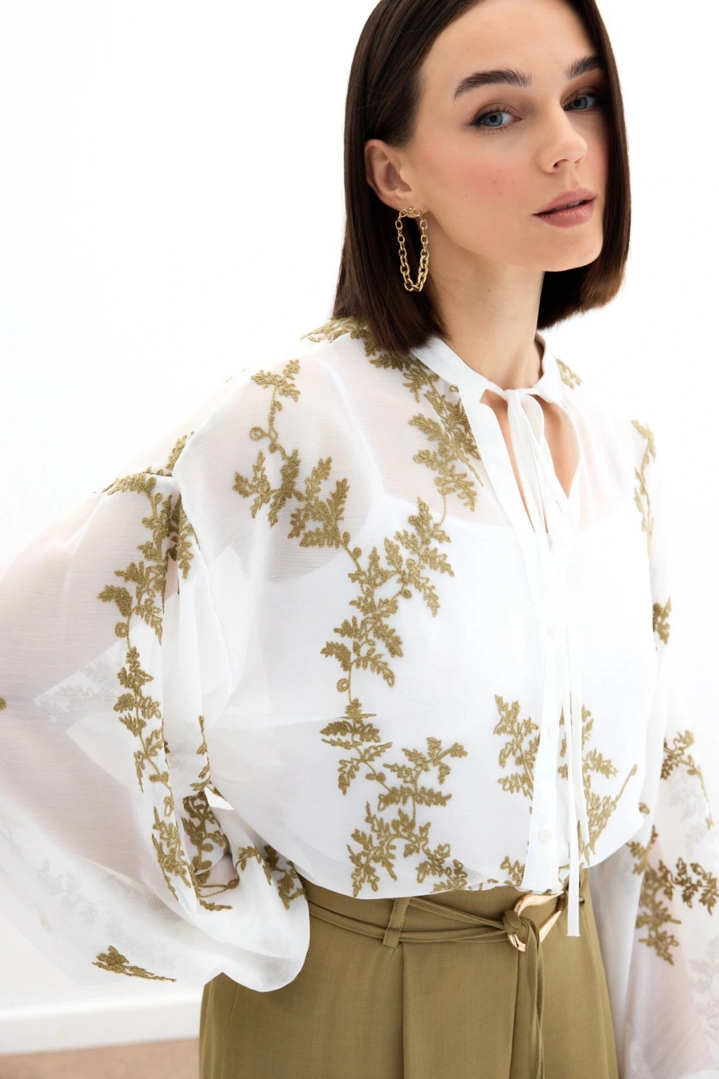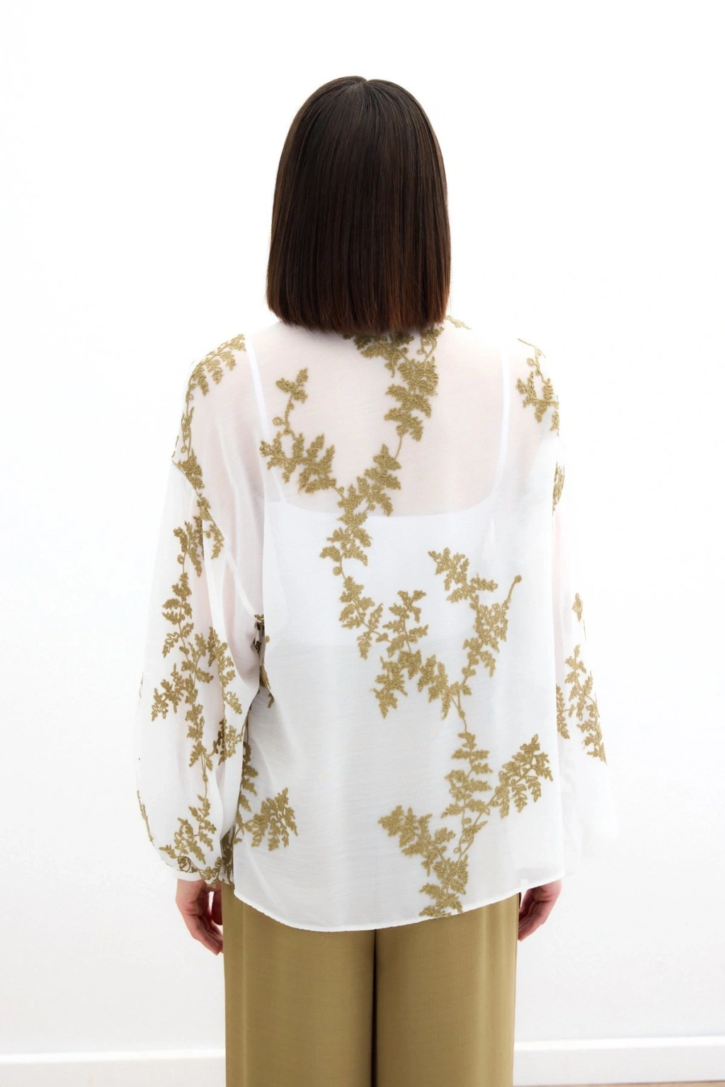 Nakışlı Şifon Gömlek - Haki