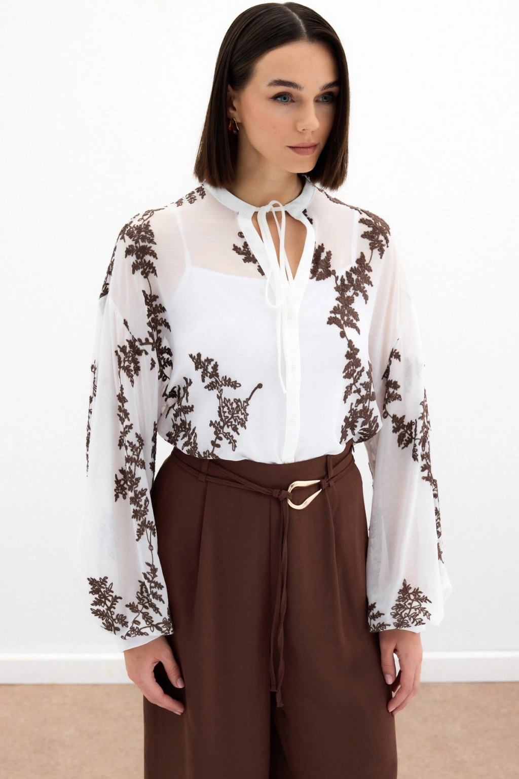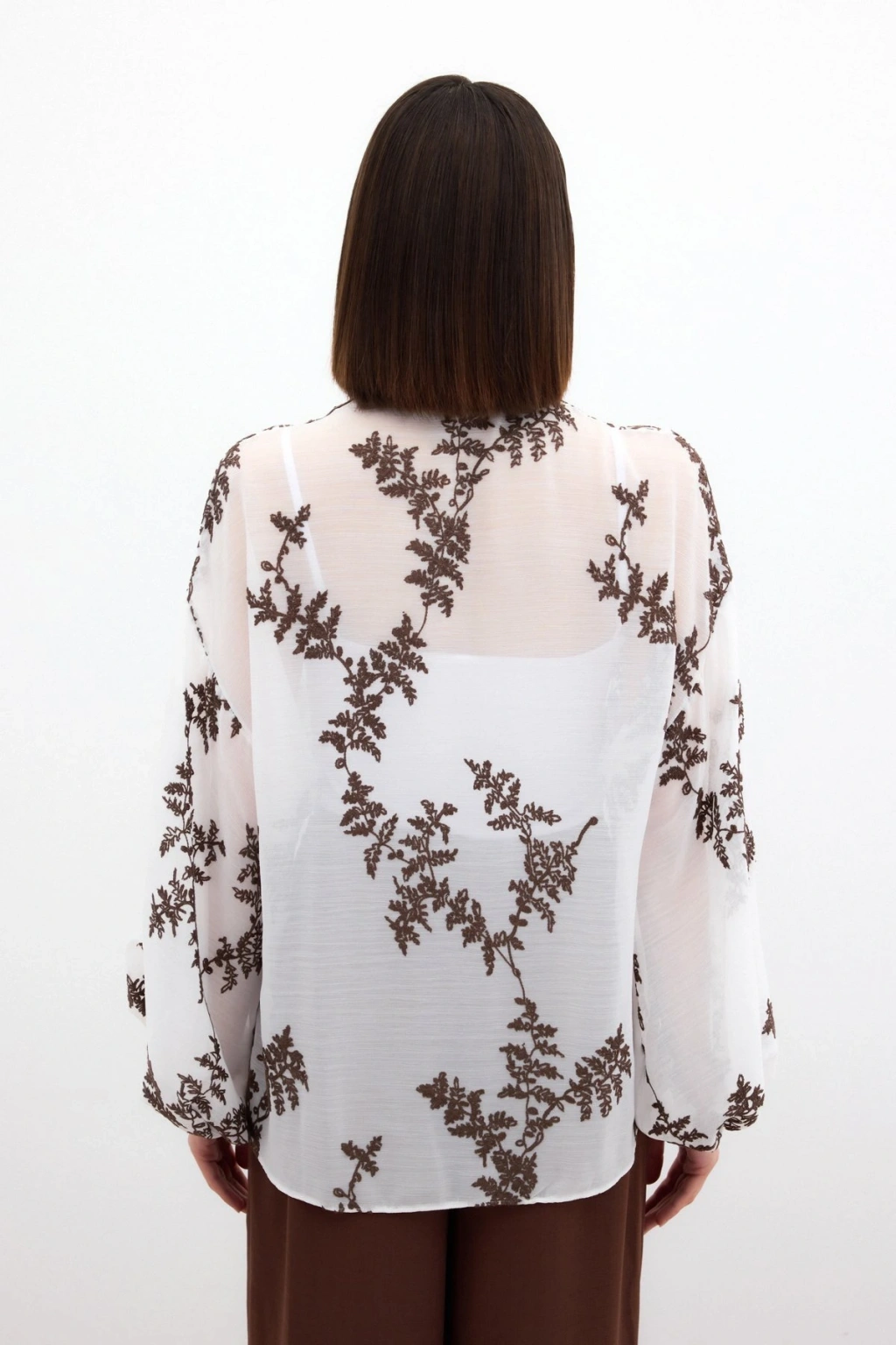 Nakışlı Şifon Gömlek - Kahve