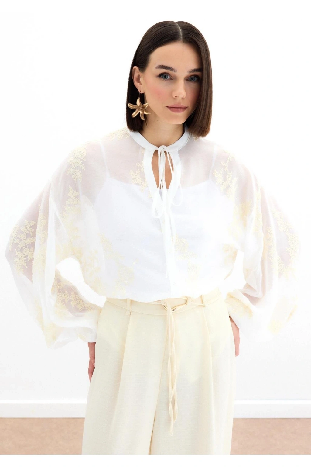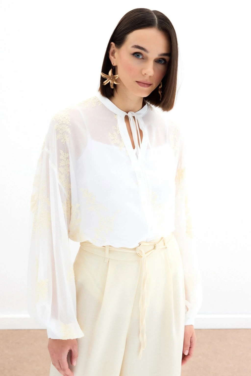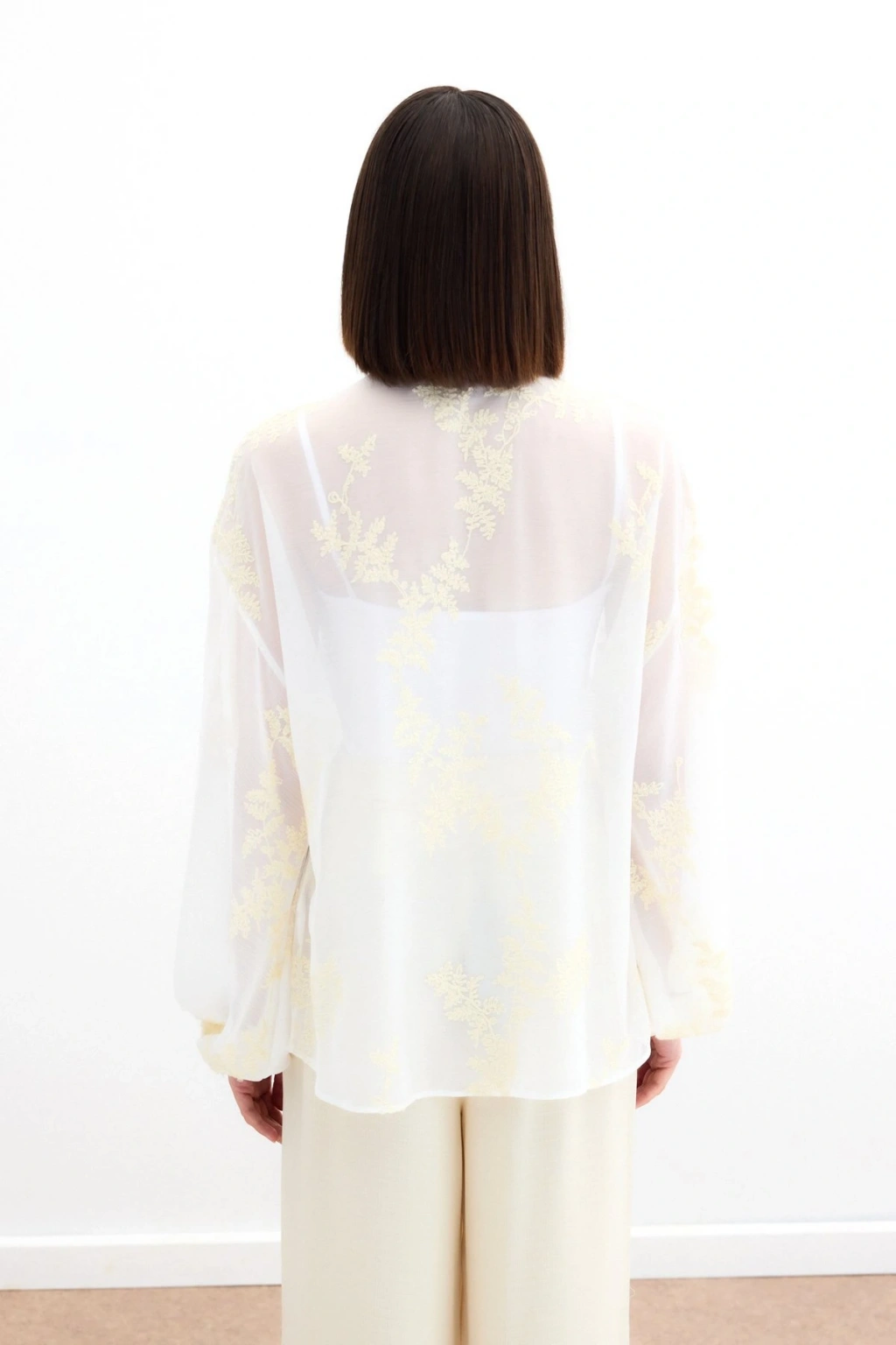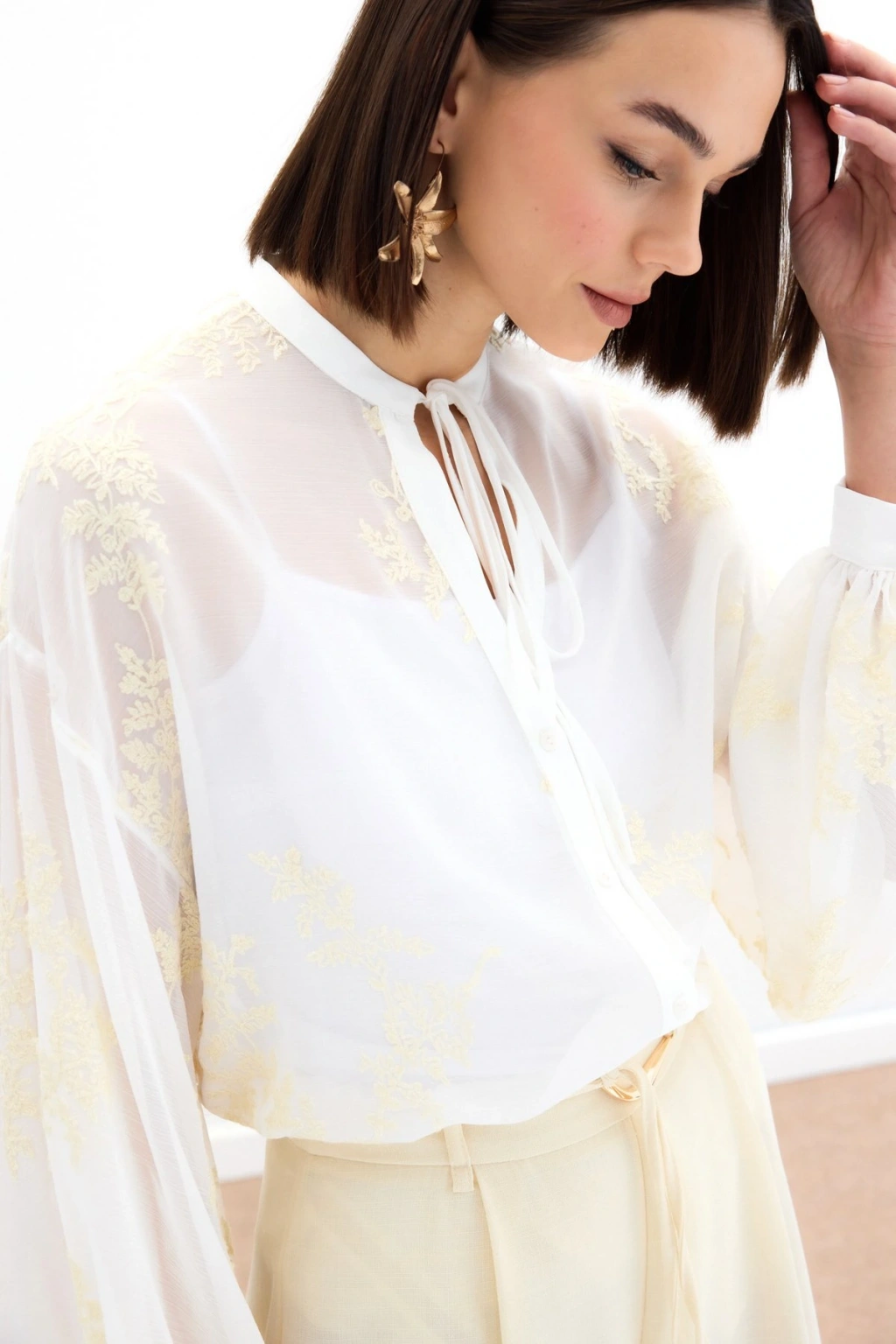Nakışlı Şifon Gömlek - Krem
