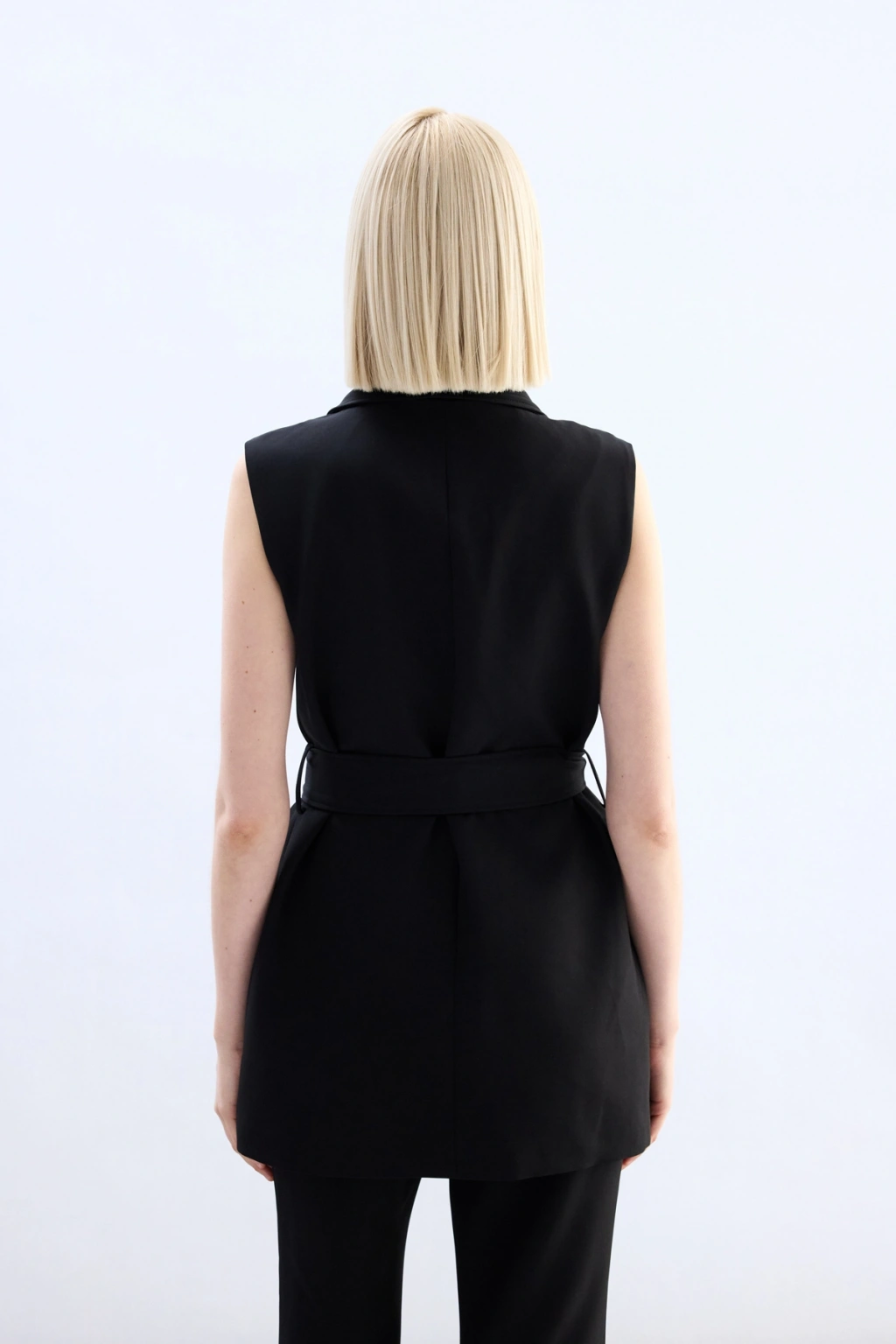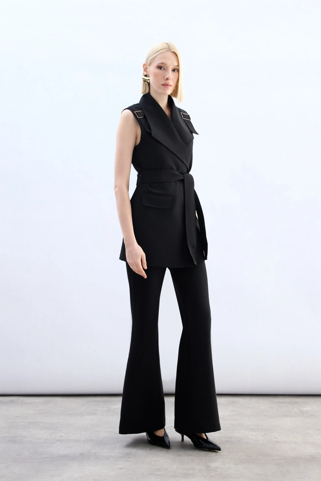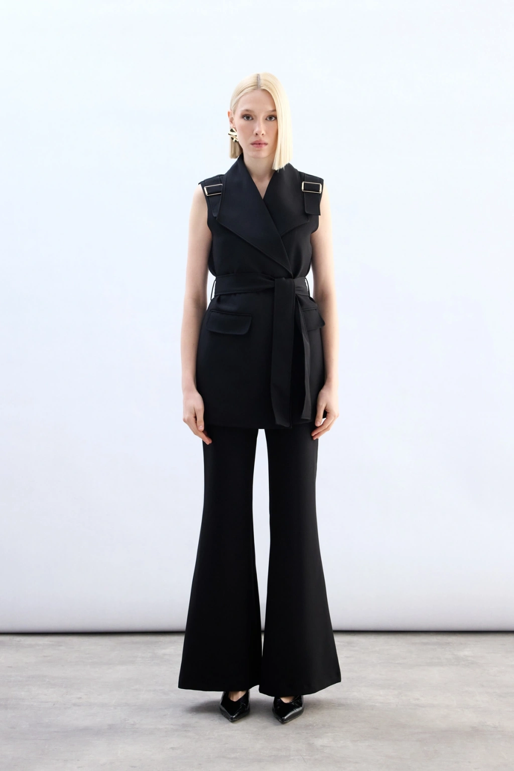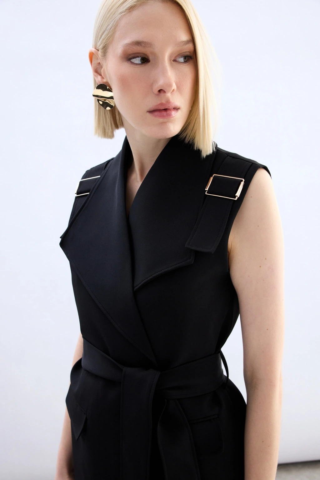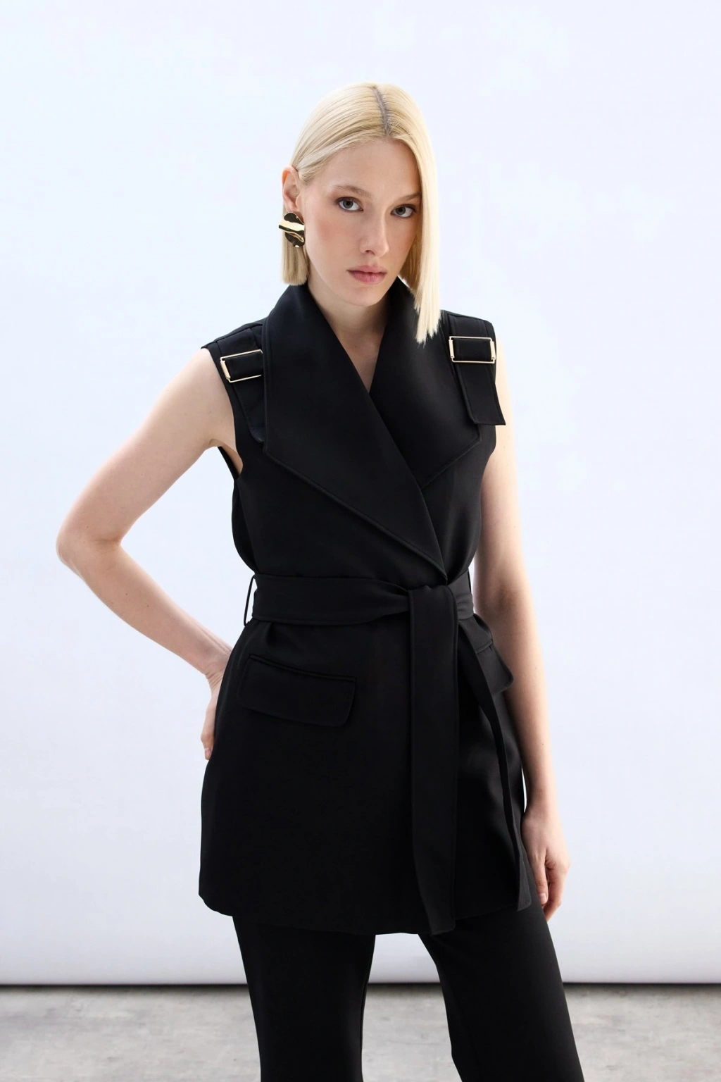 Omuz Aksesuarlı Kuşaklı Yelek - Siyah