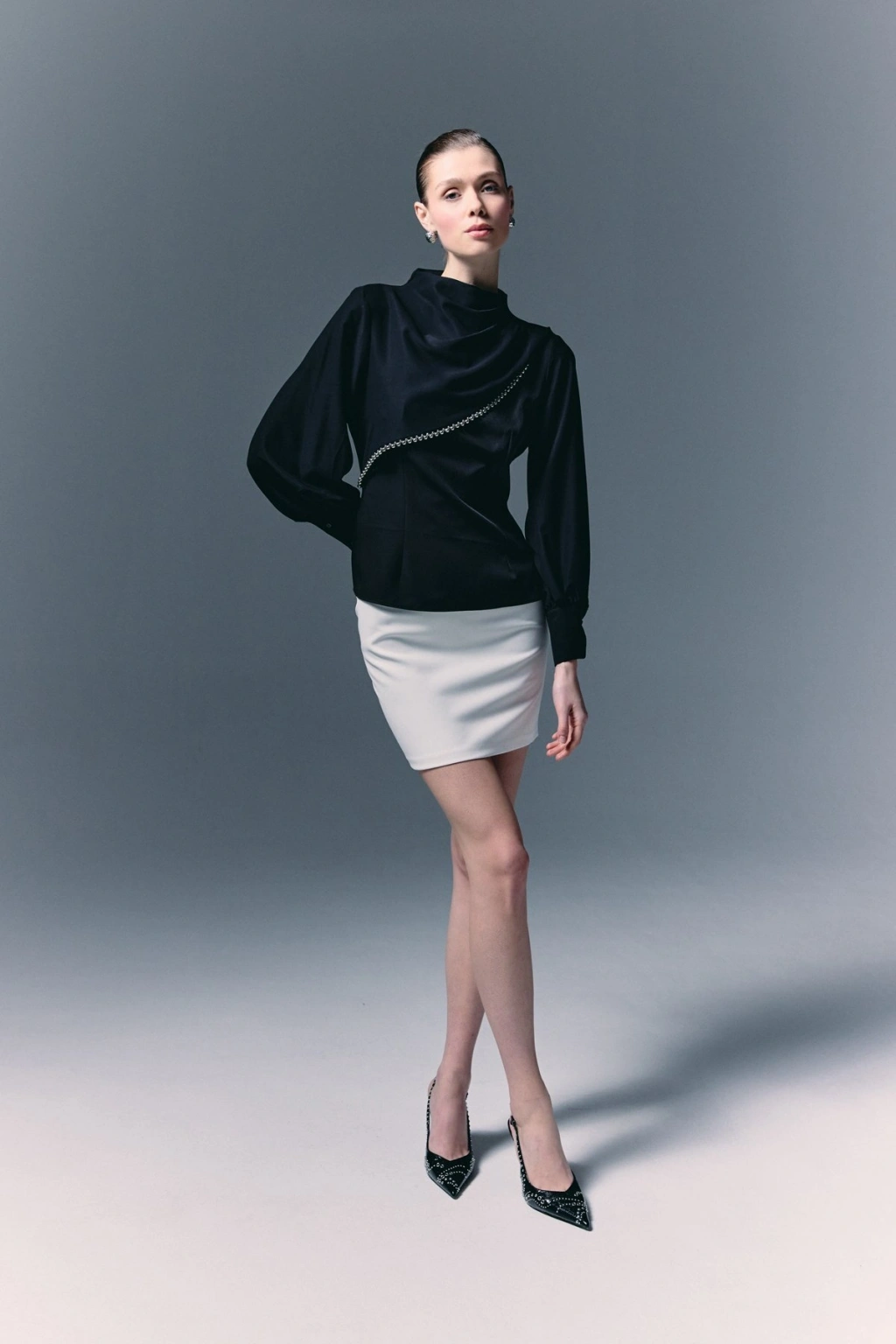 Düğmeleri Taş Detaylı Bluz - Ekru