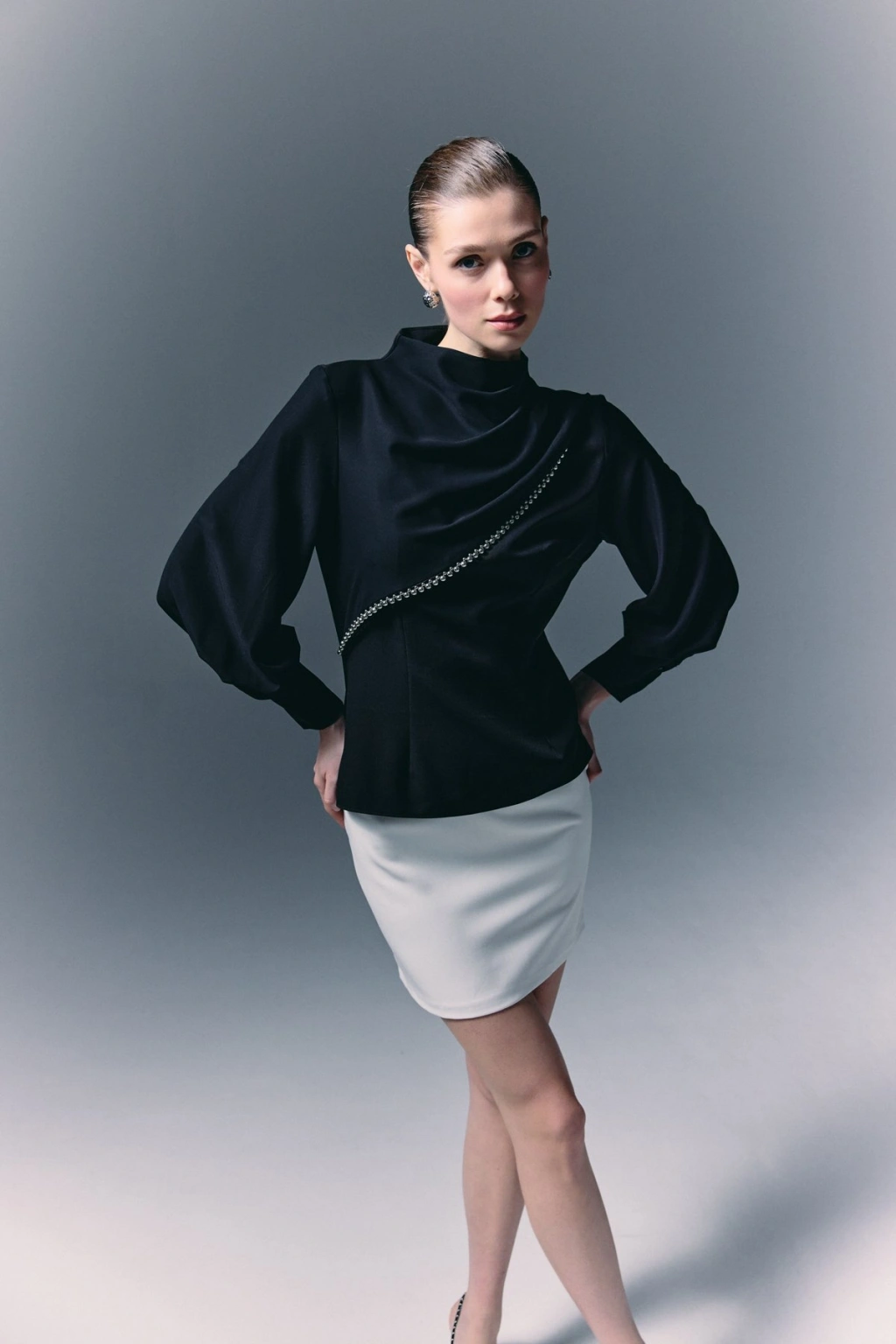 Puantiye Desenli Kolsuz Bluz - Siyah