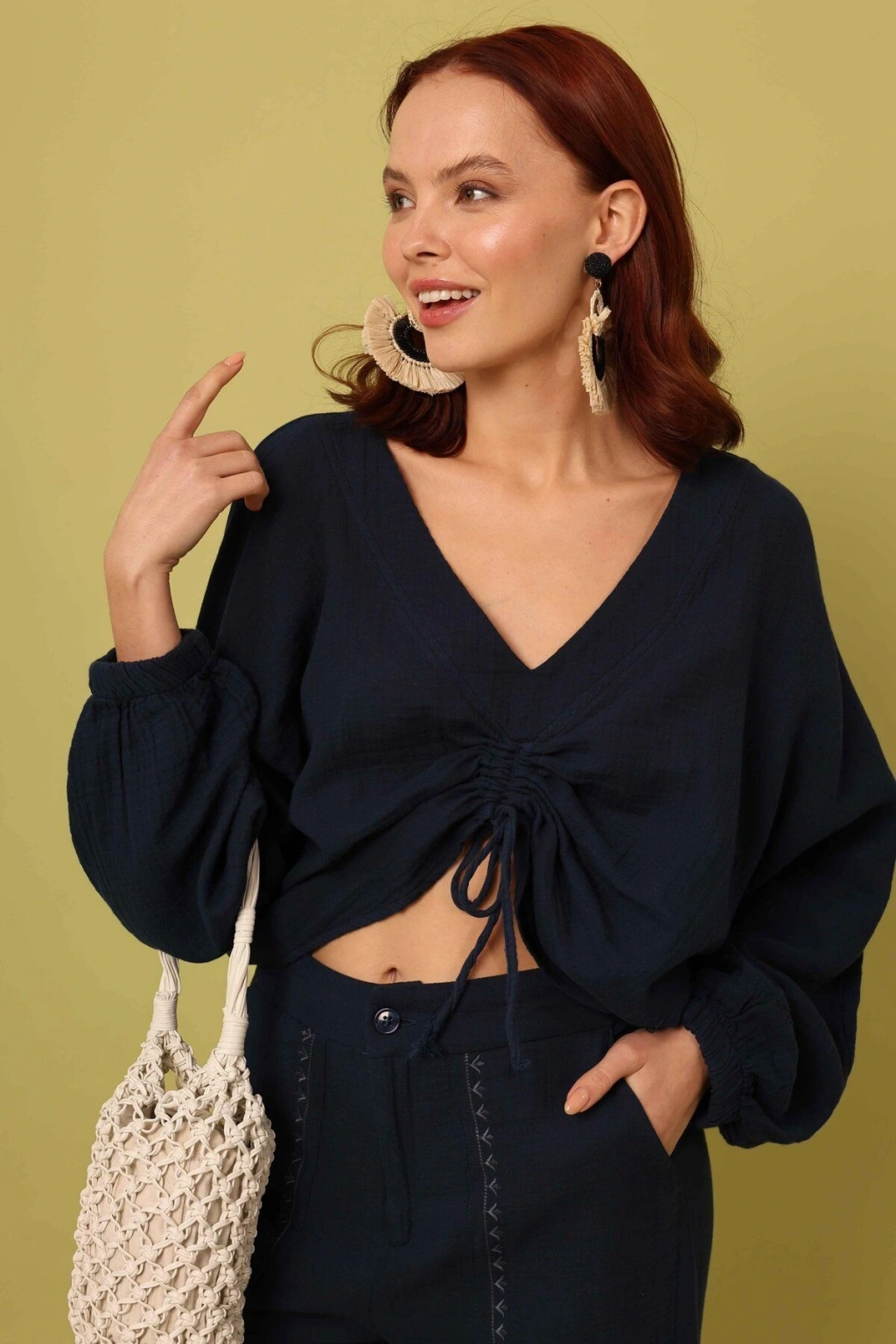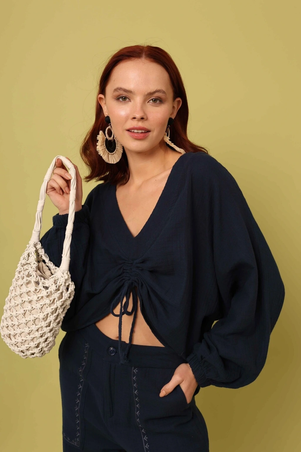 Dik Yaka Şifon Kol Detaylı Bluz - Bej