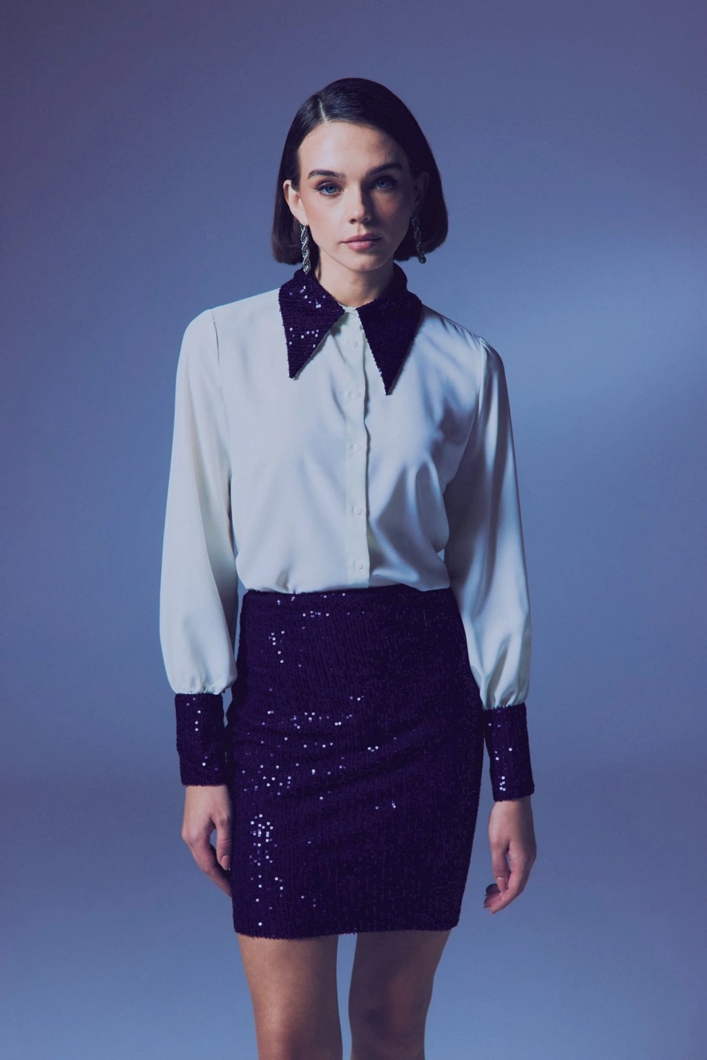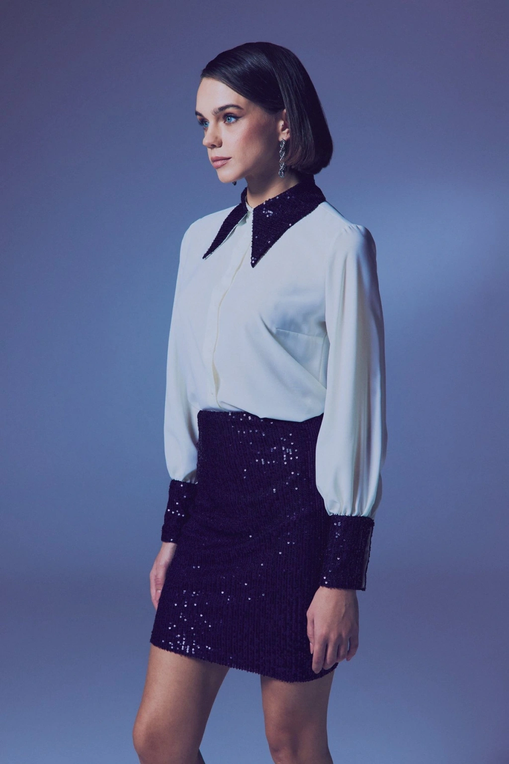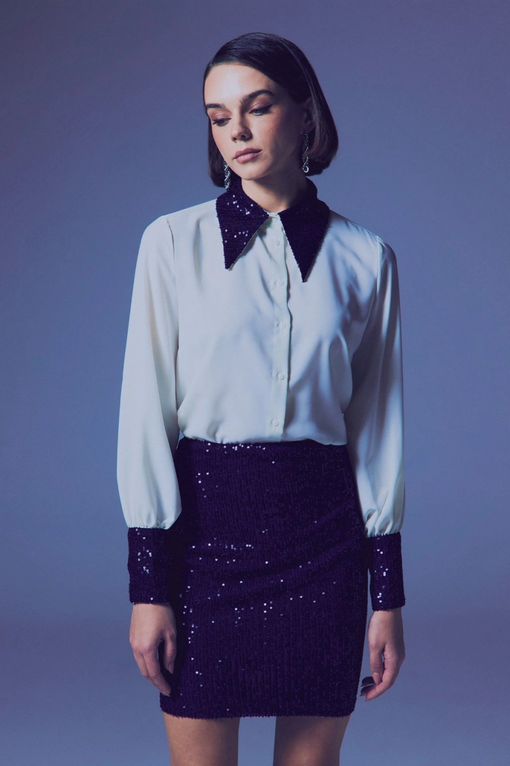 Payet Detaylı Gömlek - Ekru-Lacivert