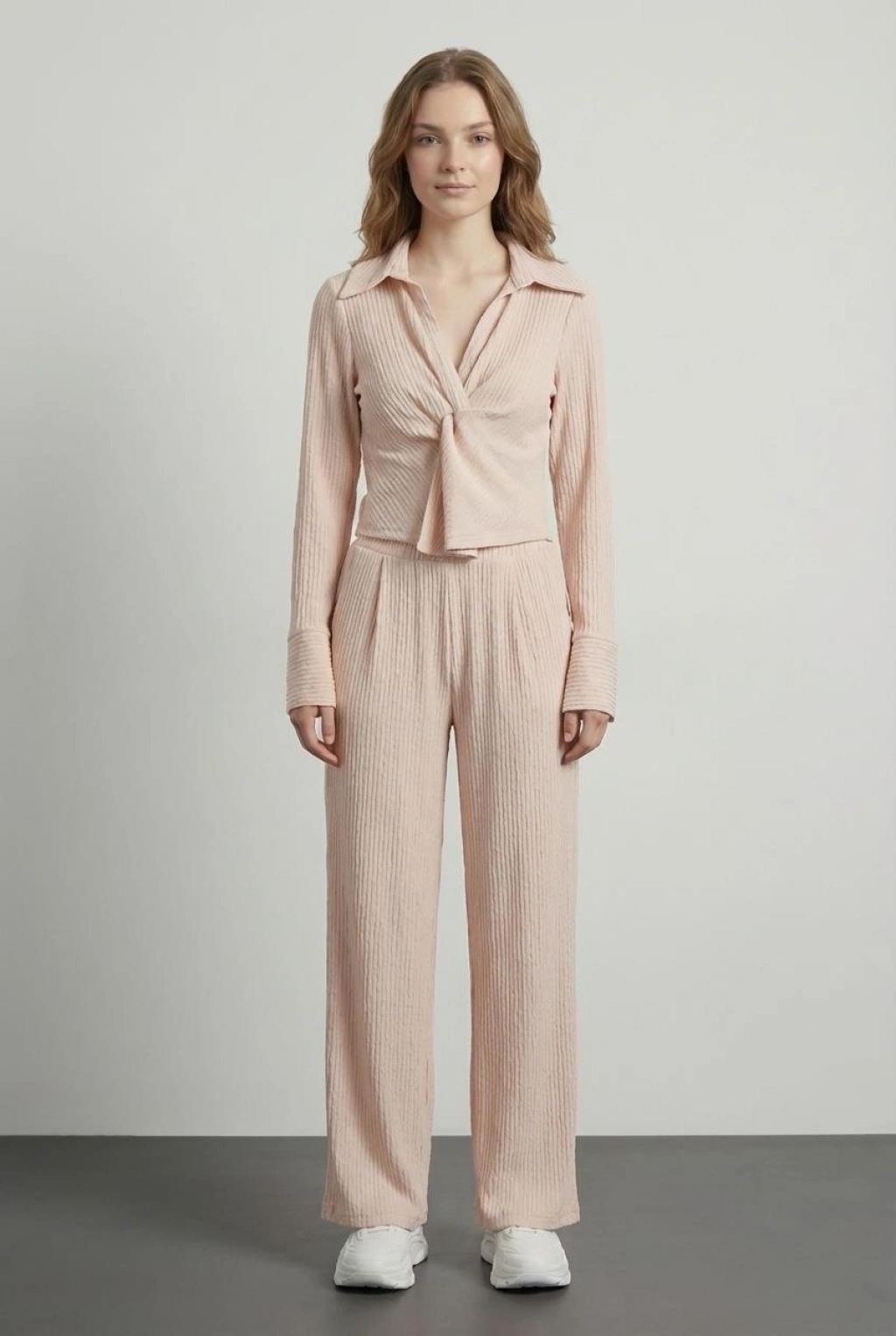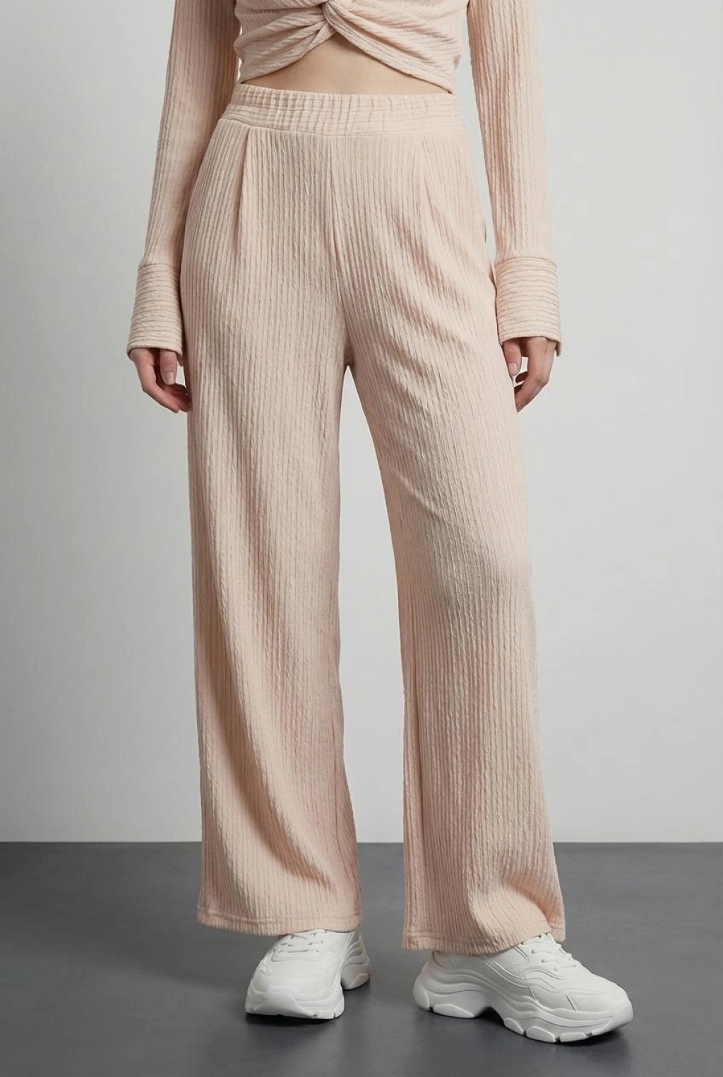 Çizgili Bağcıklı Bol Paça Pantolon Ekru