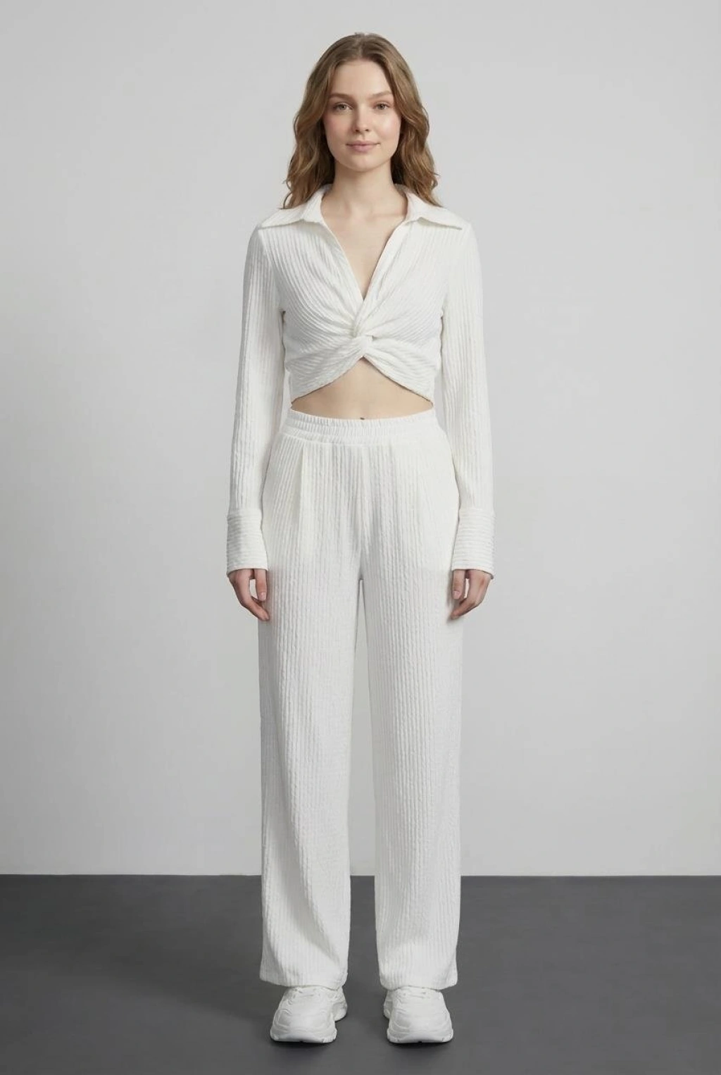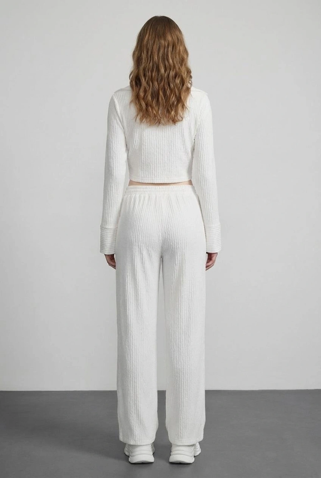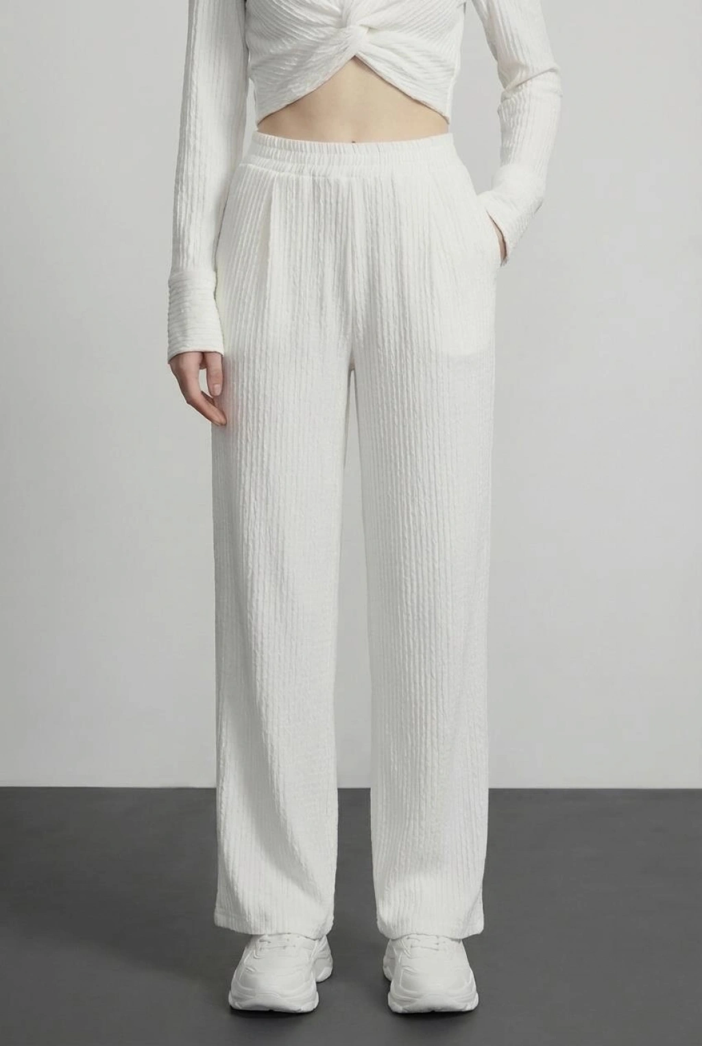 Çizgili Bağcıklı Bol Paça Pantolon Ekru