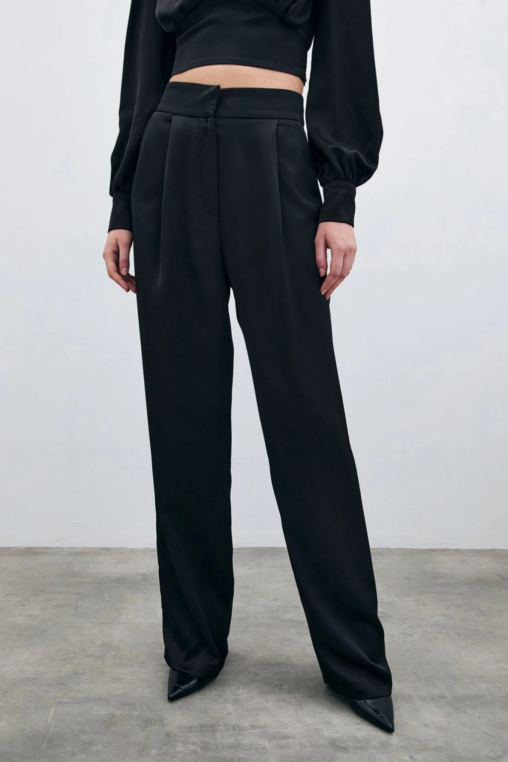 Pileli Saten Krep Pantolon - Siyah