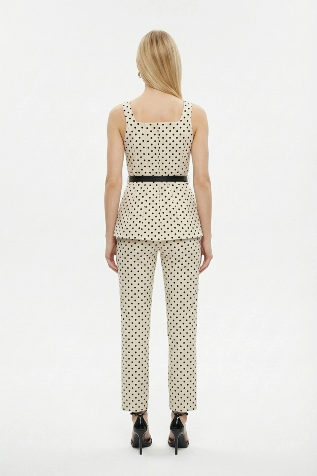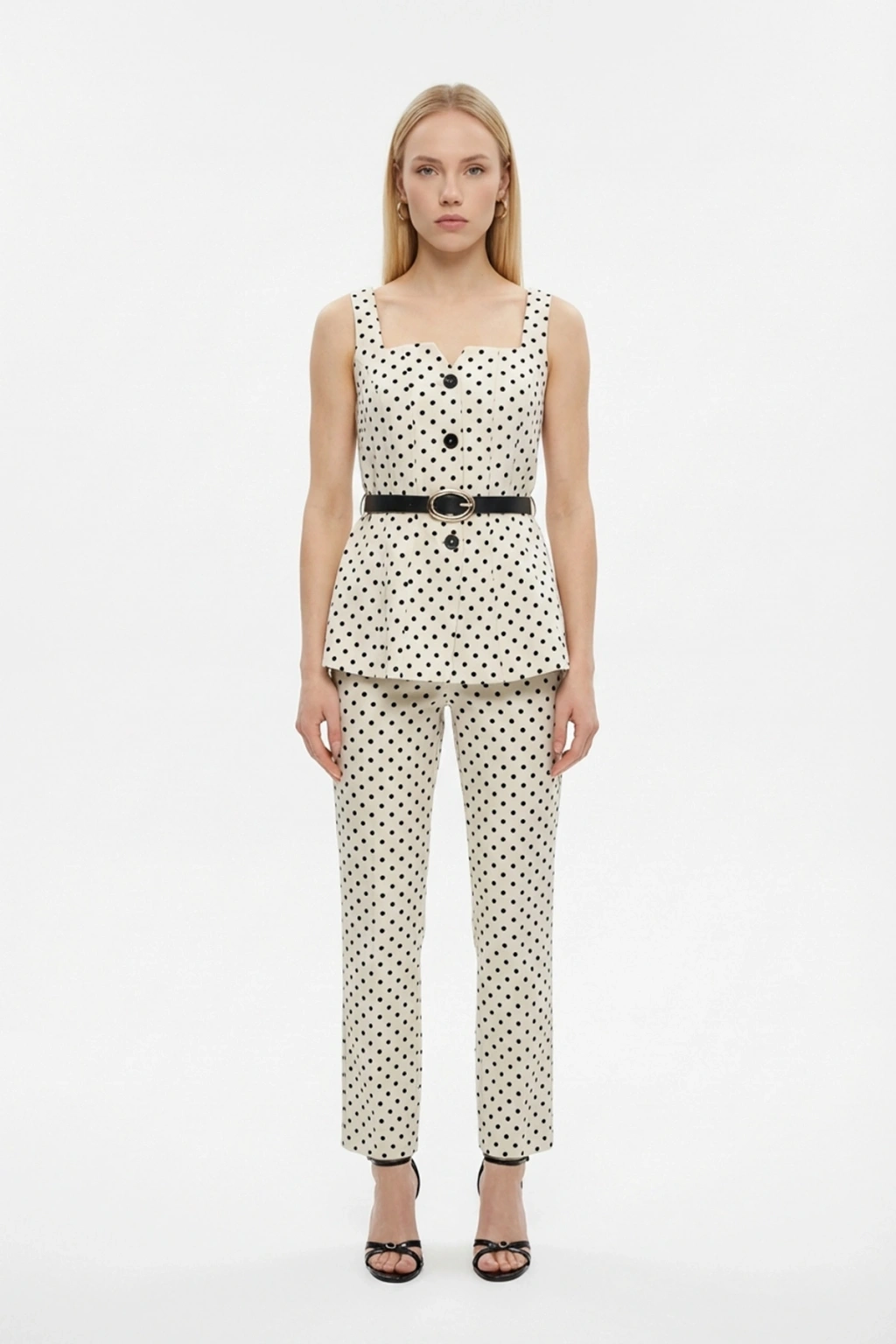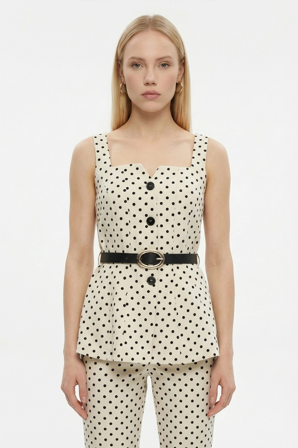 Puantiyeli Kemerli Kare Yaka Bluz Krem