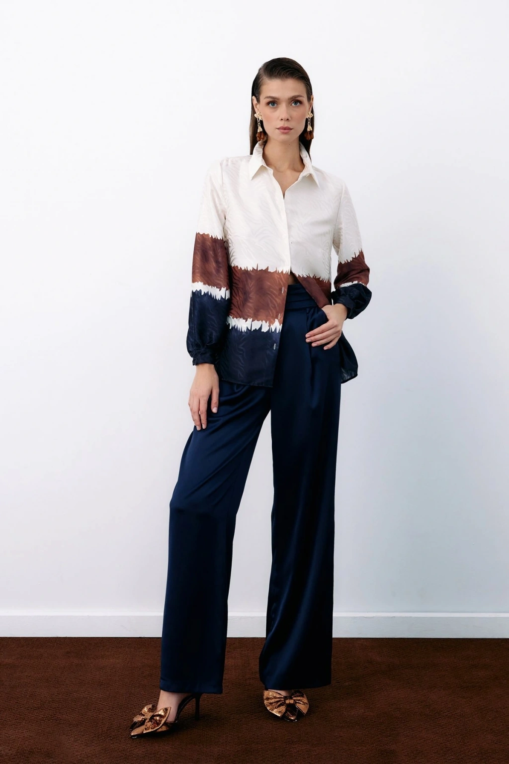 Desenli Fular Yaka Gömlek - Kahve