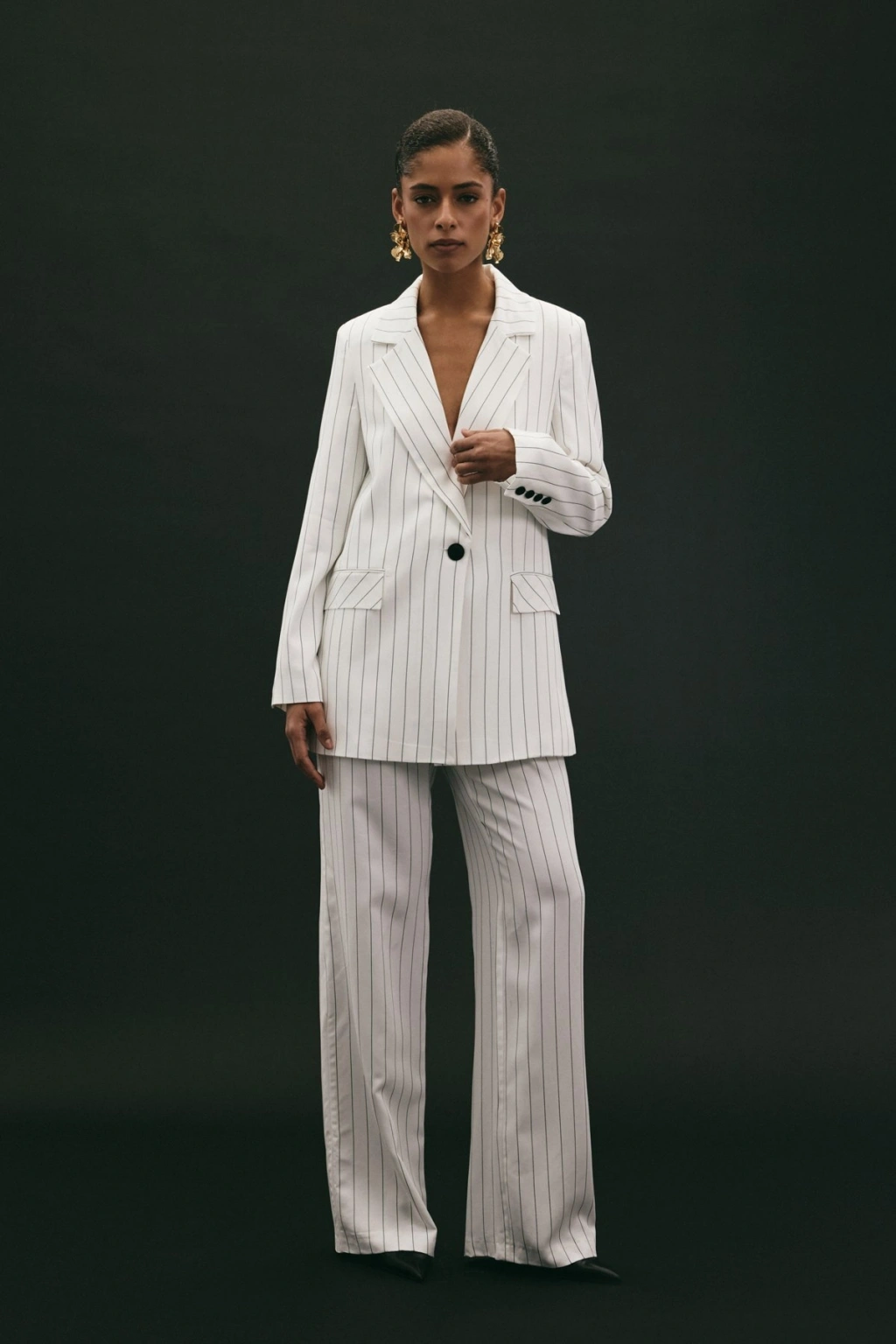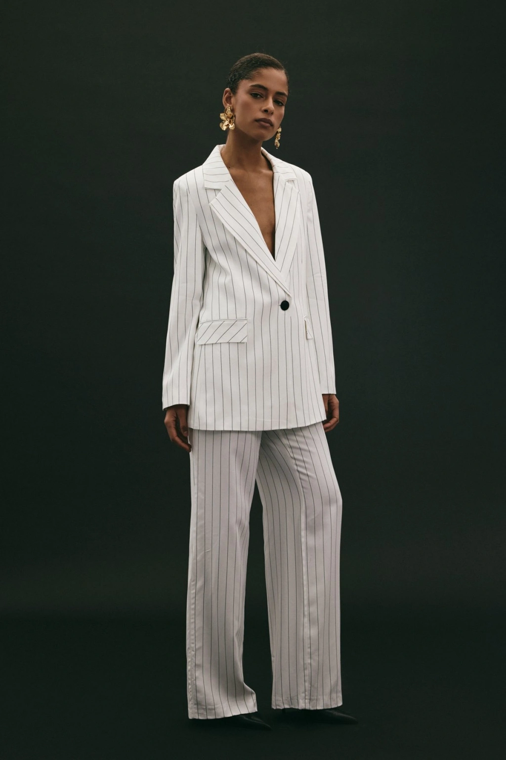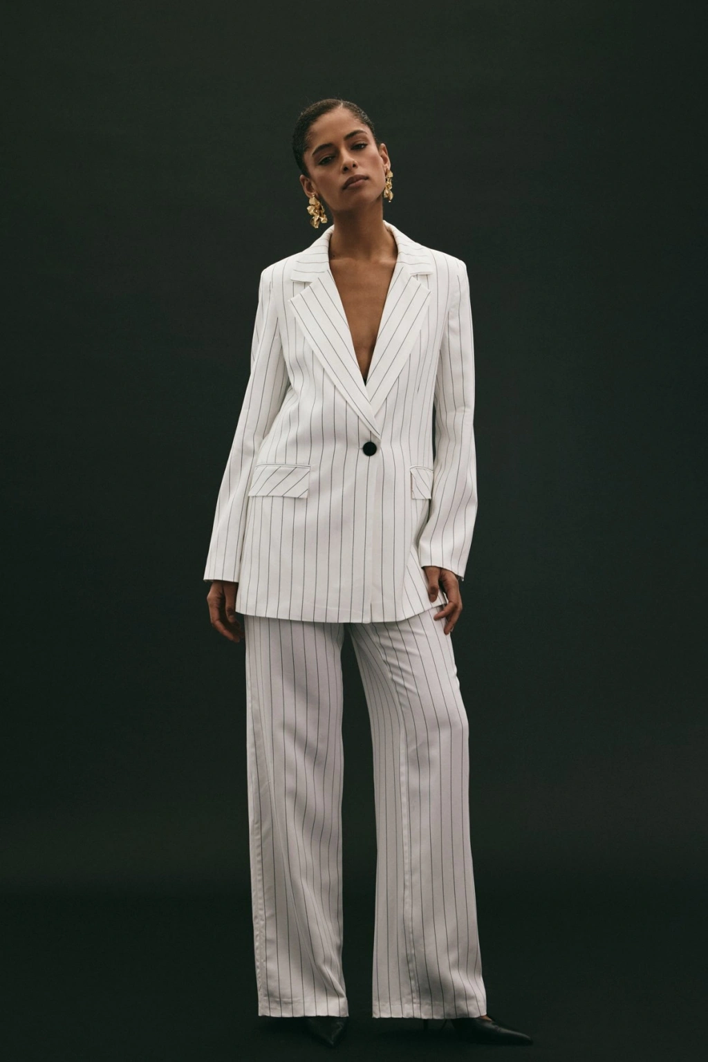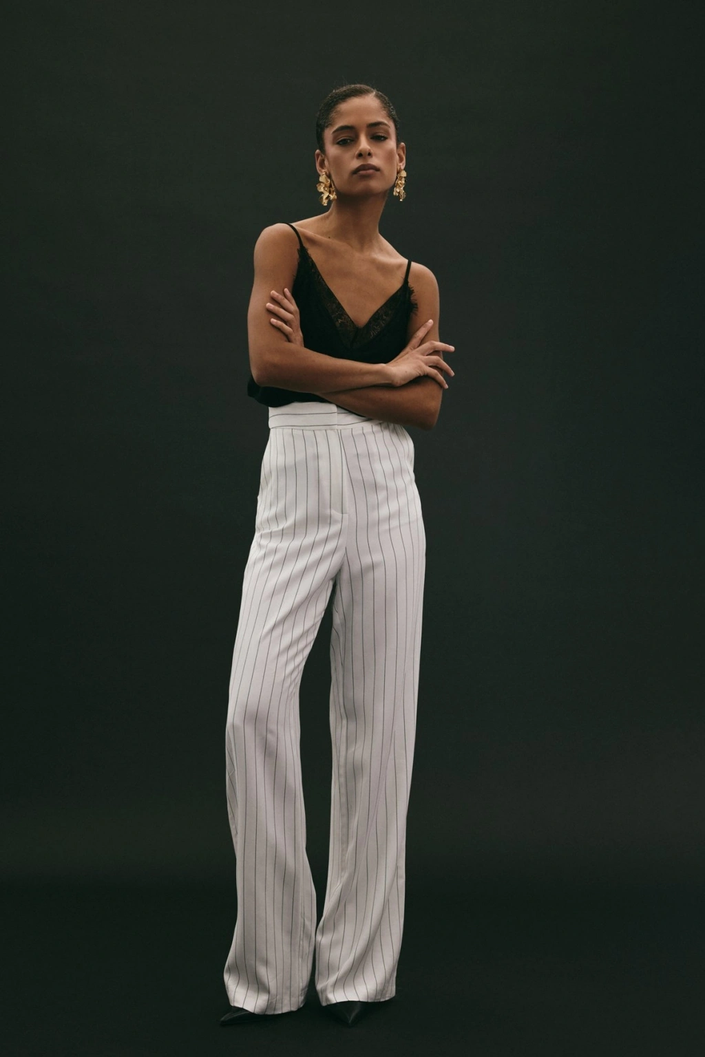 Yüksek Bel Önü Dikişli Beli Apoletli Düğmeli Boru Paça Kumaş Pantolon - Siyah