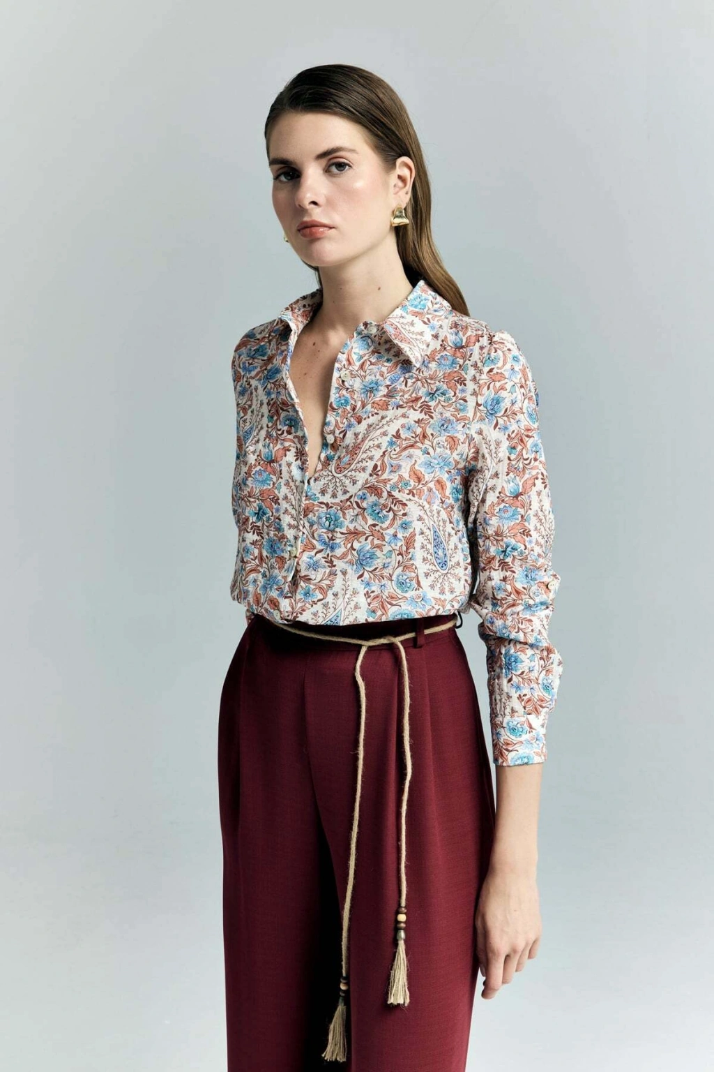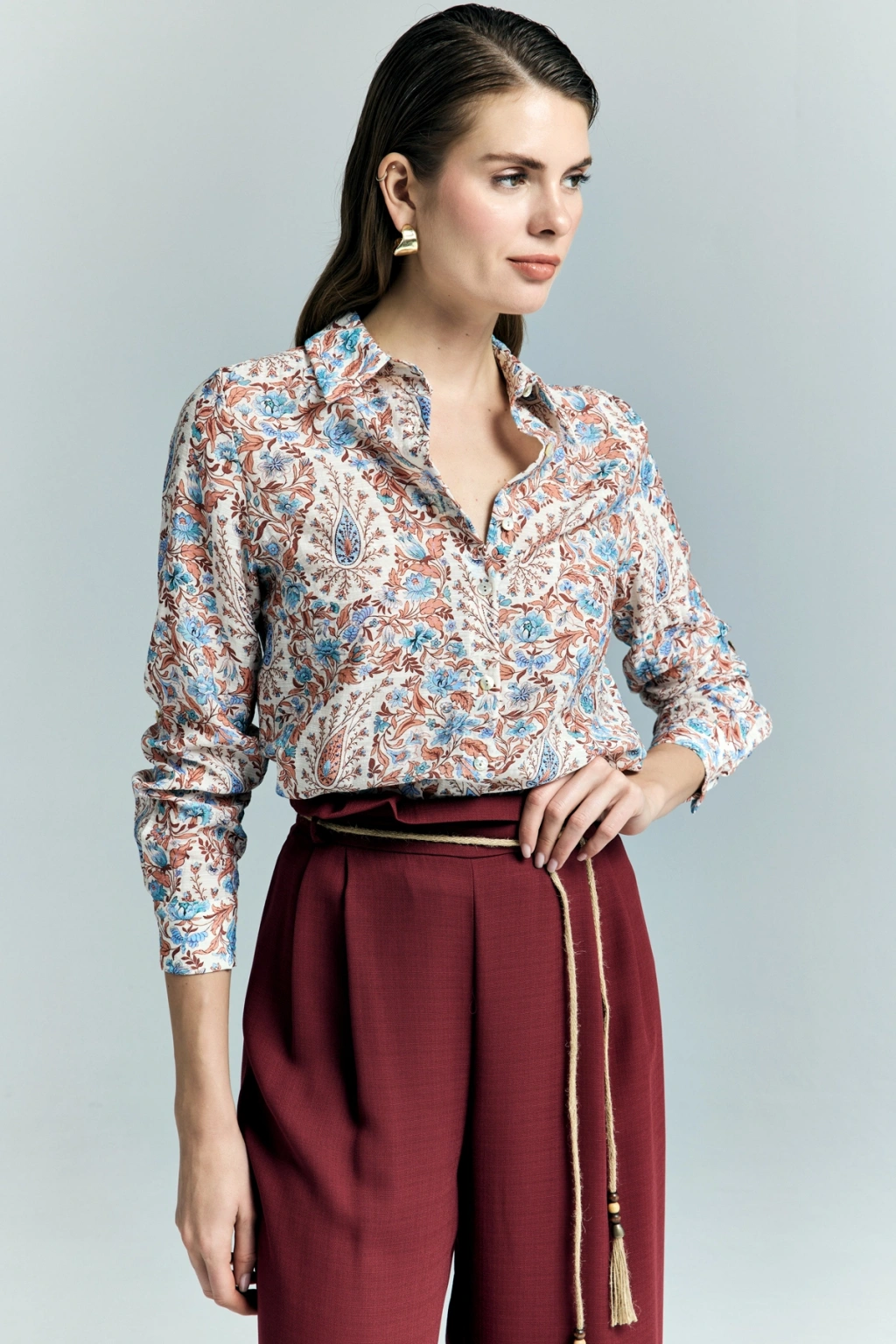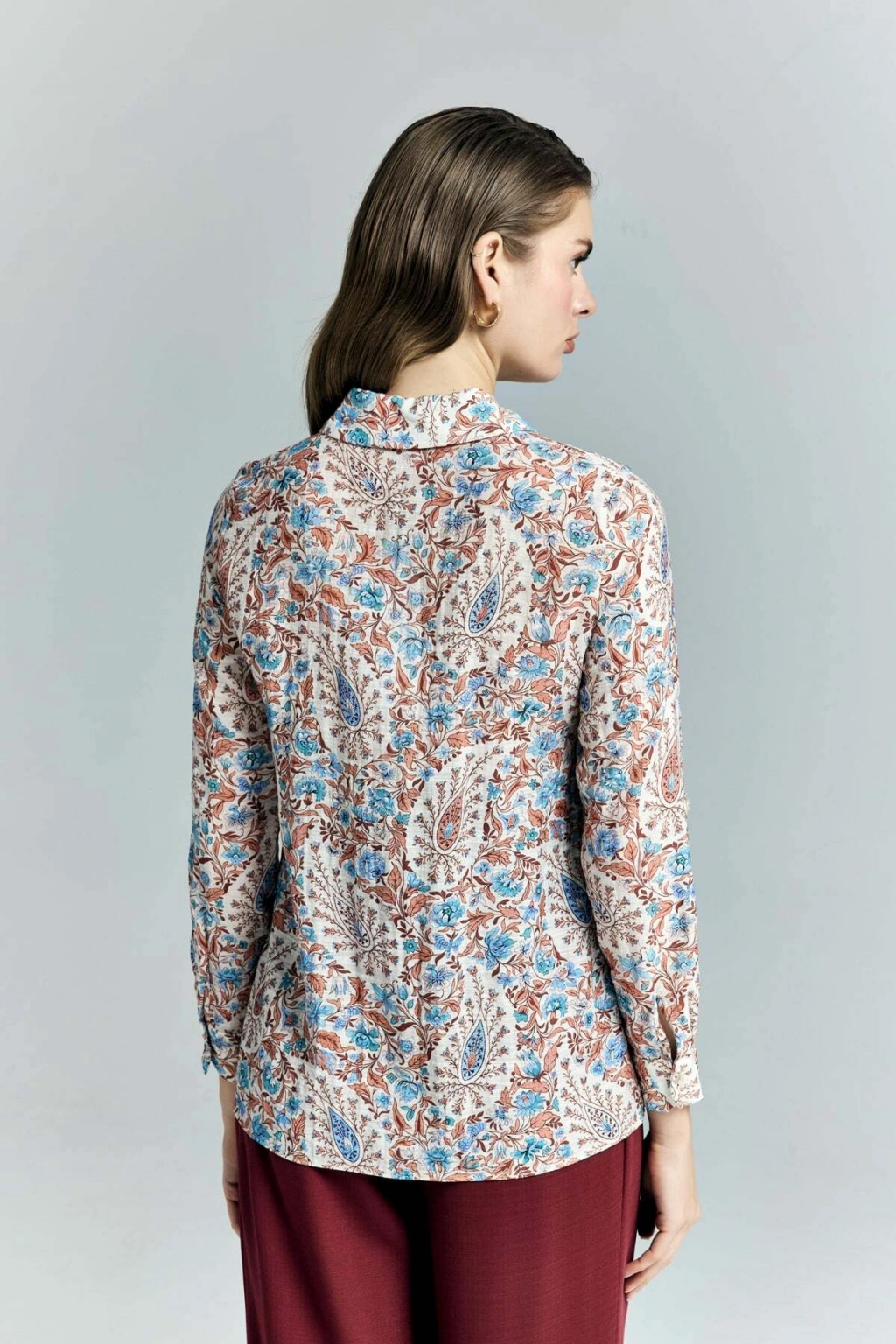 Şal Desen Kolu Katlamalı Gömlek - Mavi