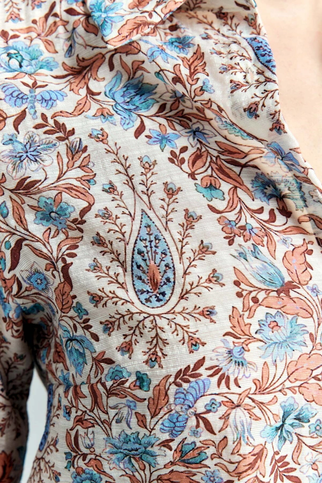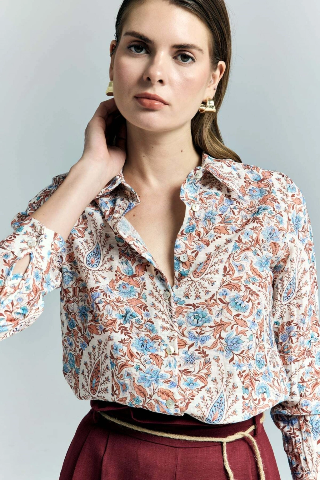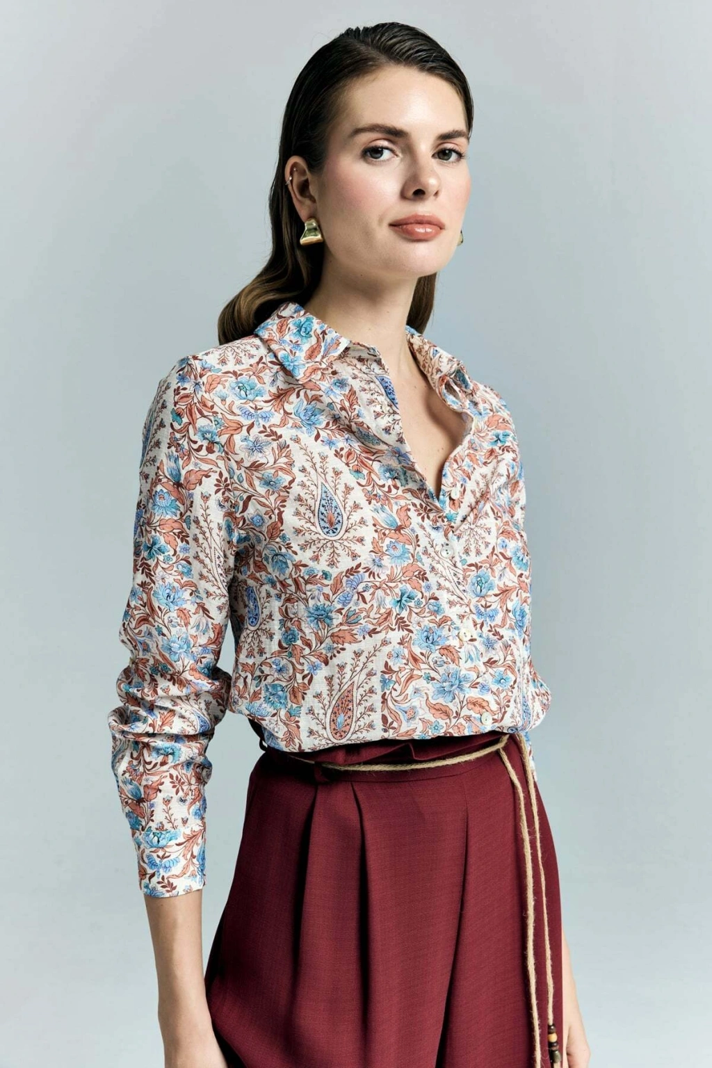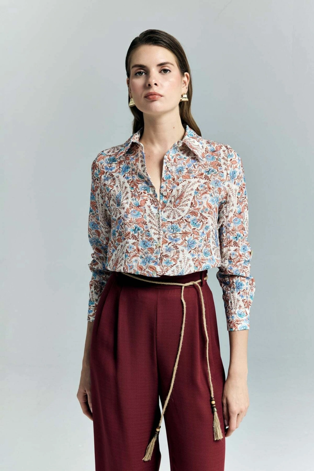 Şal Desen Kolu Katlamalı Gömlek - Mavi