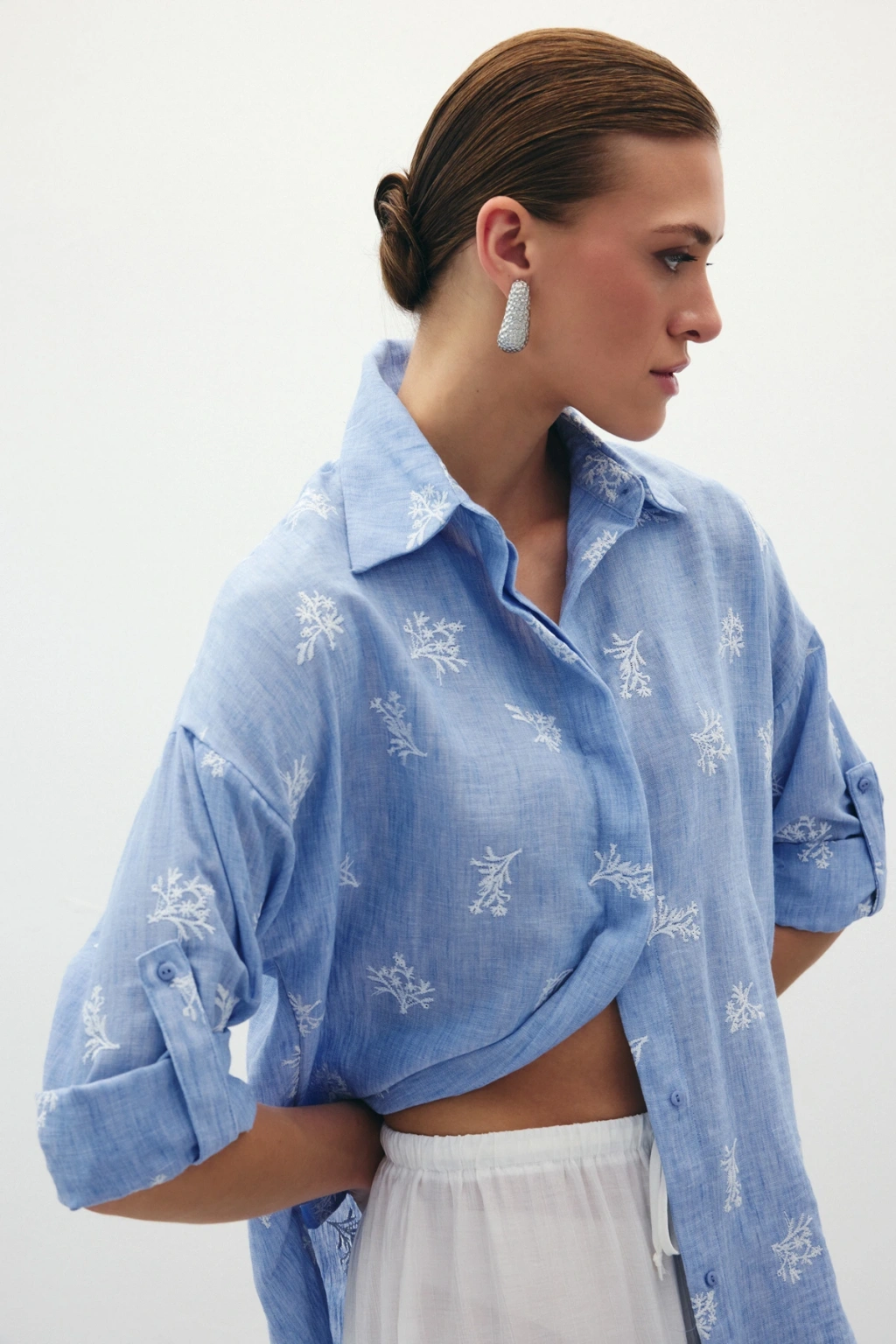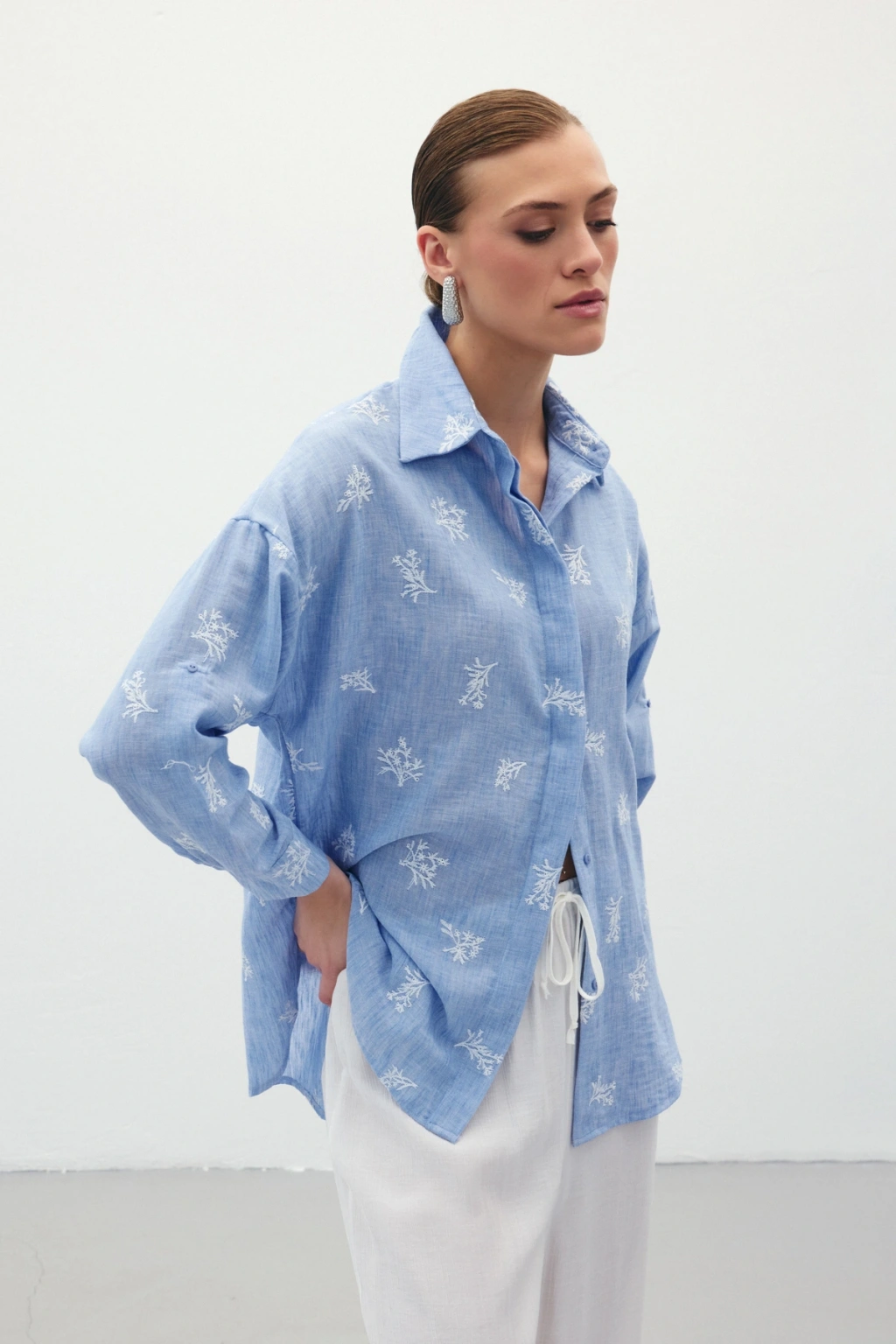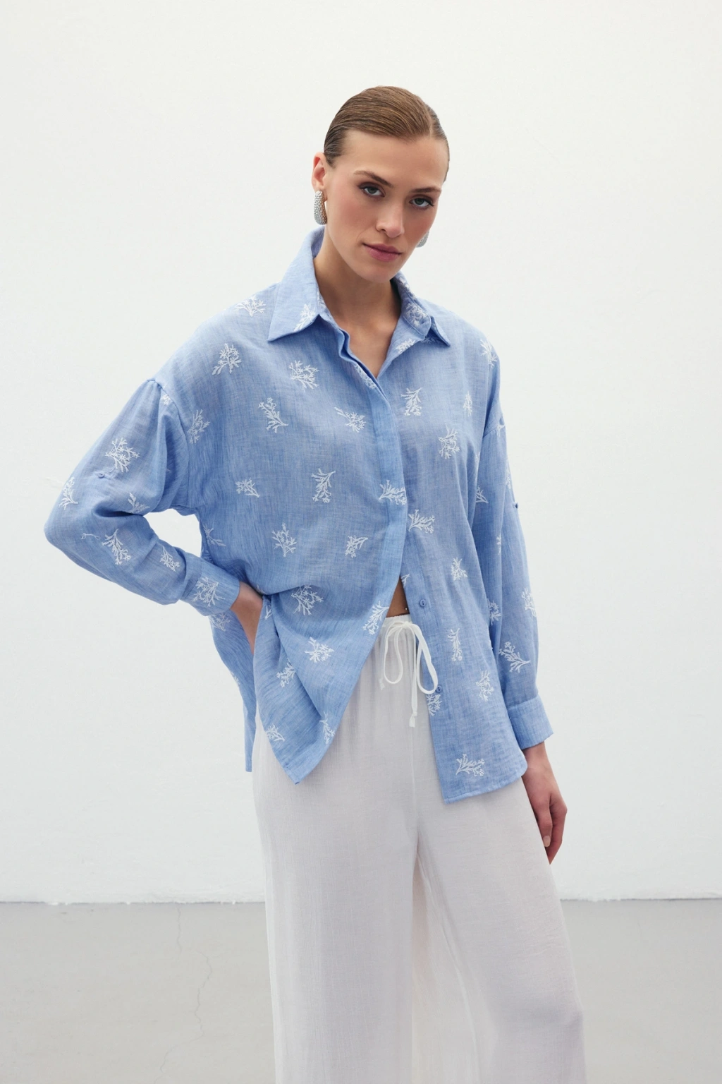 Çiçek Desenli Gömlek - SAX MAVİ