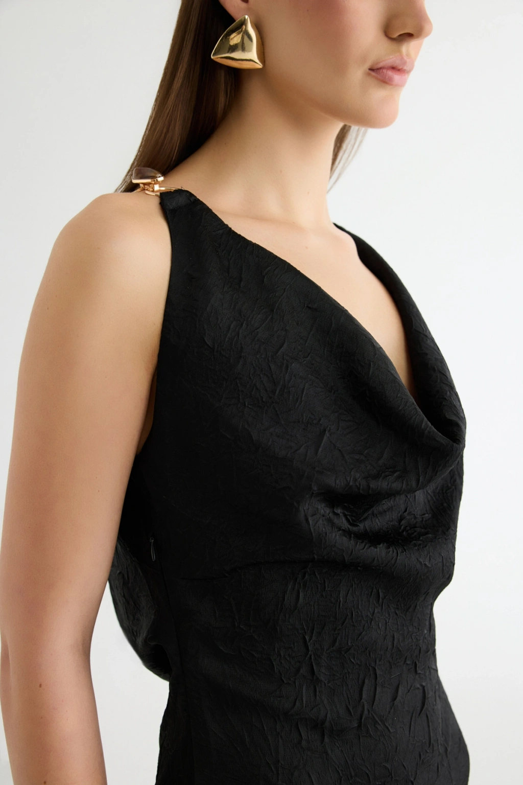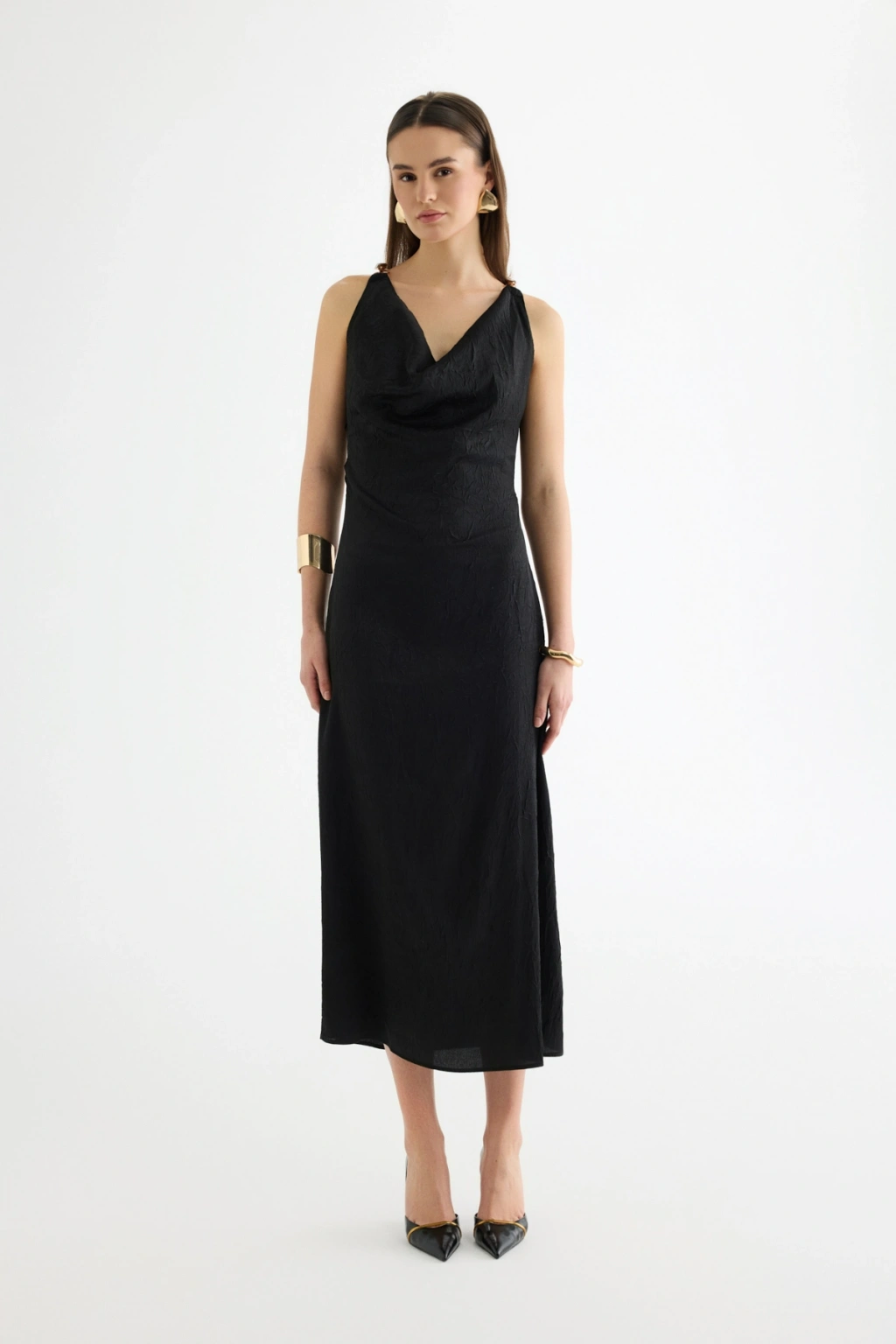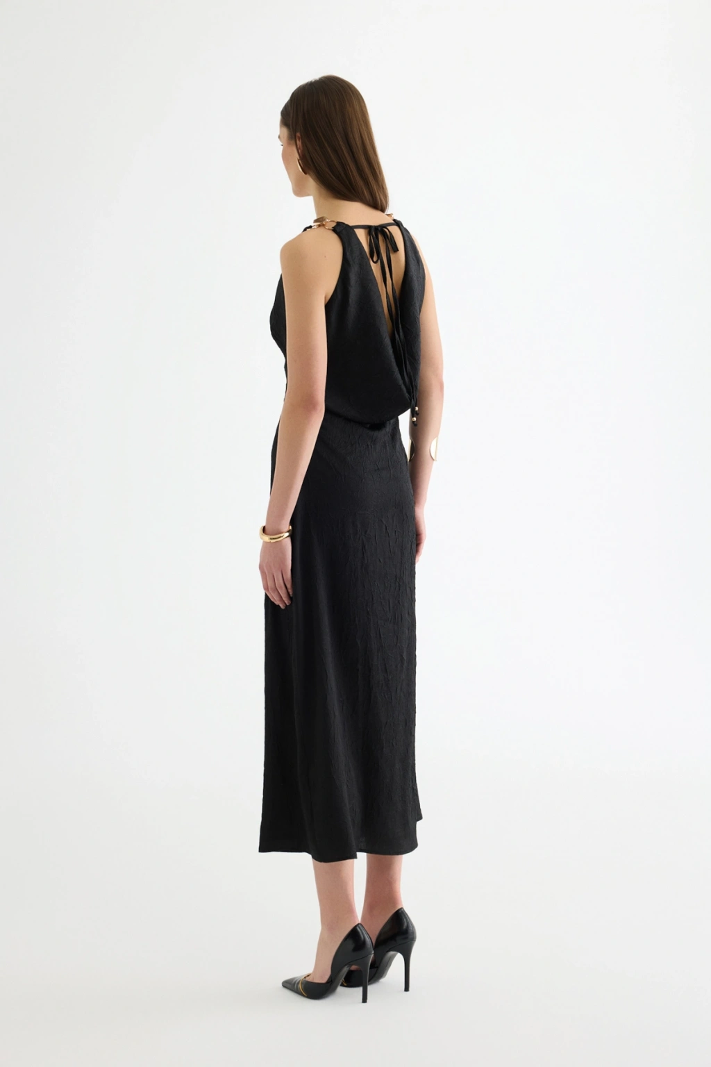 Sırt Bağlamalı Degaje Yaka Midi Elbise Siyah