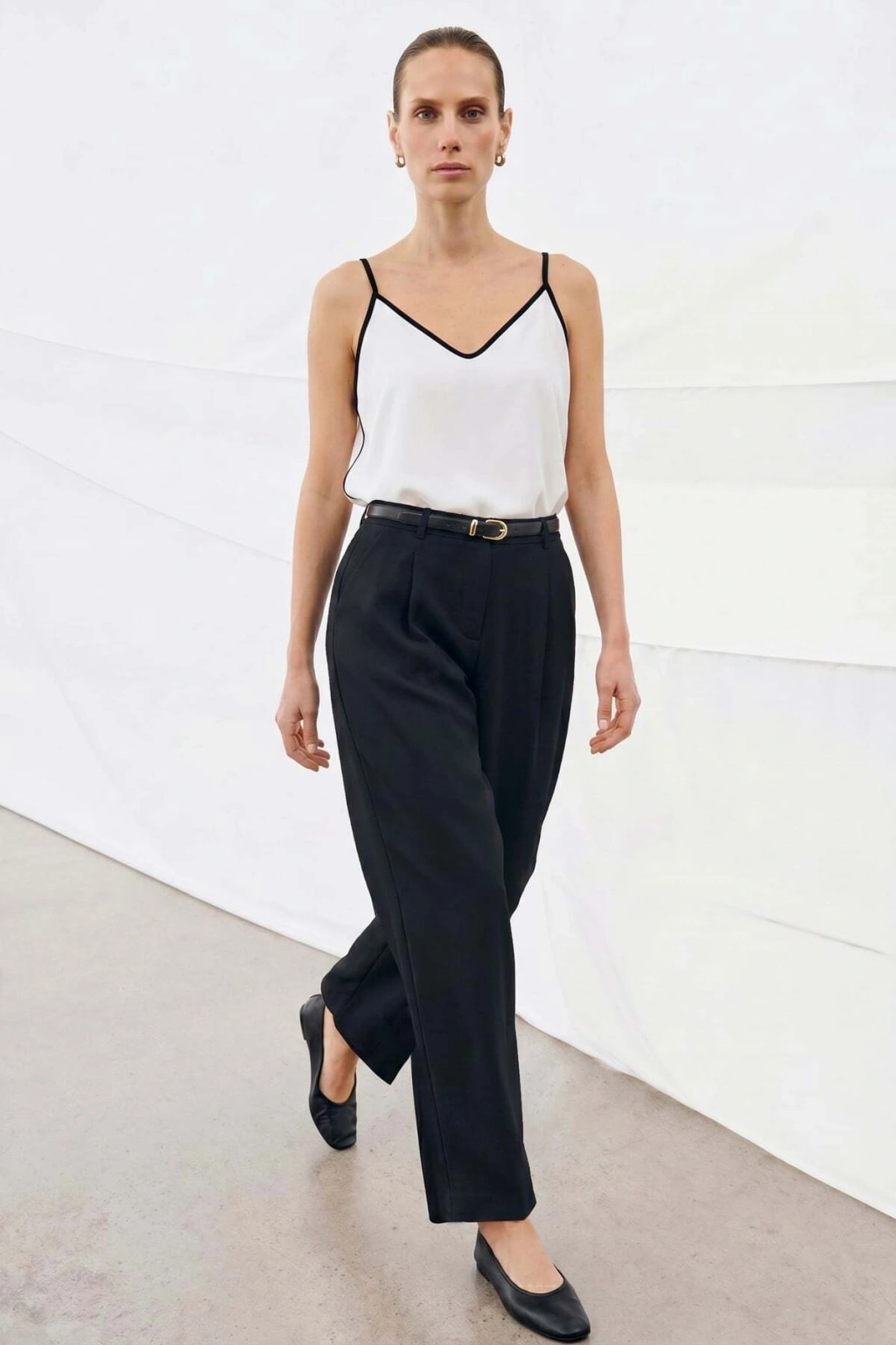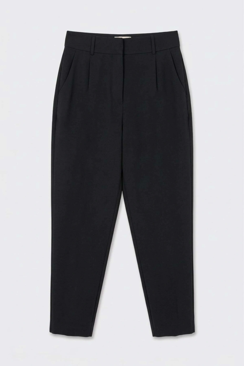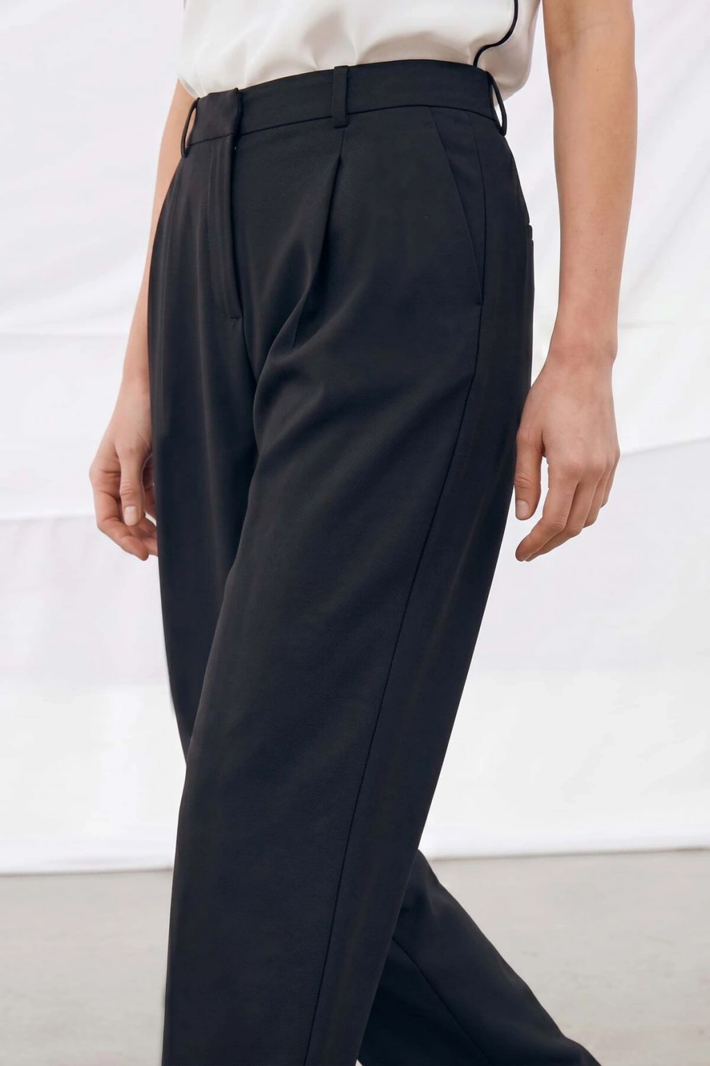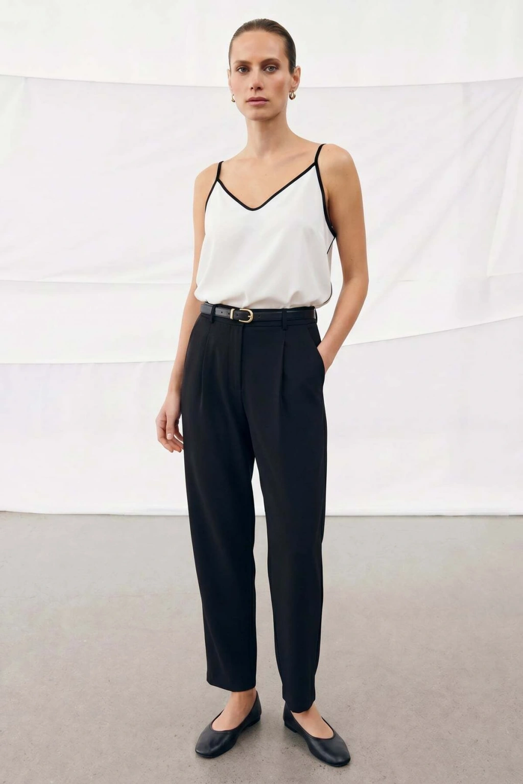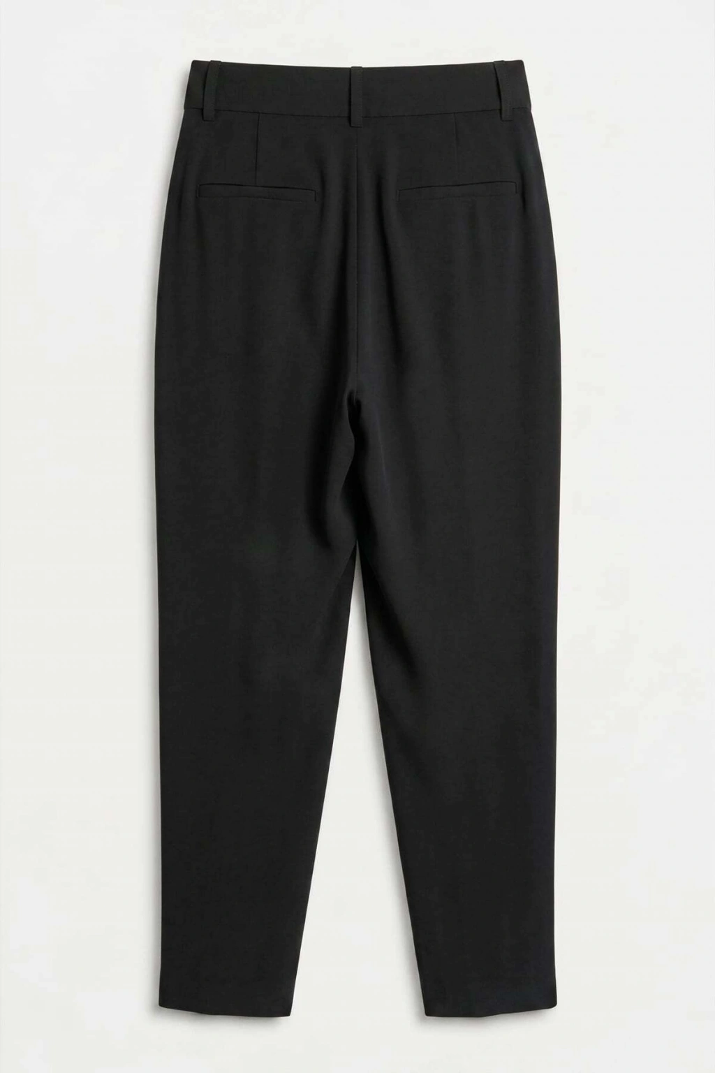 Yüksek Bel Önü Dikişli Beli Apoletli Düğmeli Boru Paça Kumaş Pantolon - Siyah