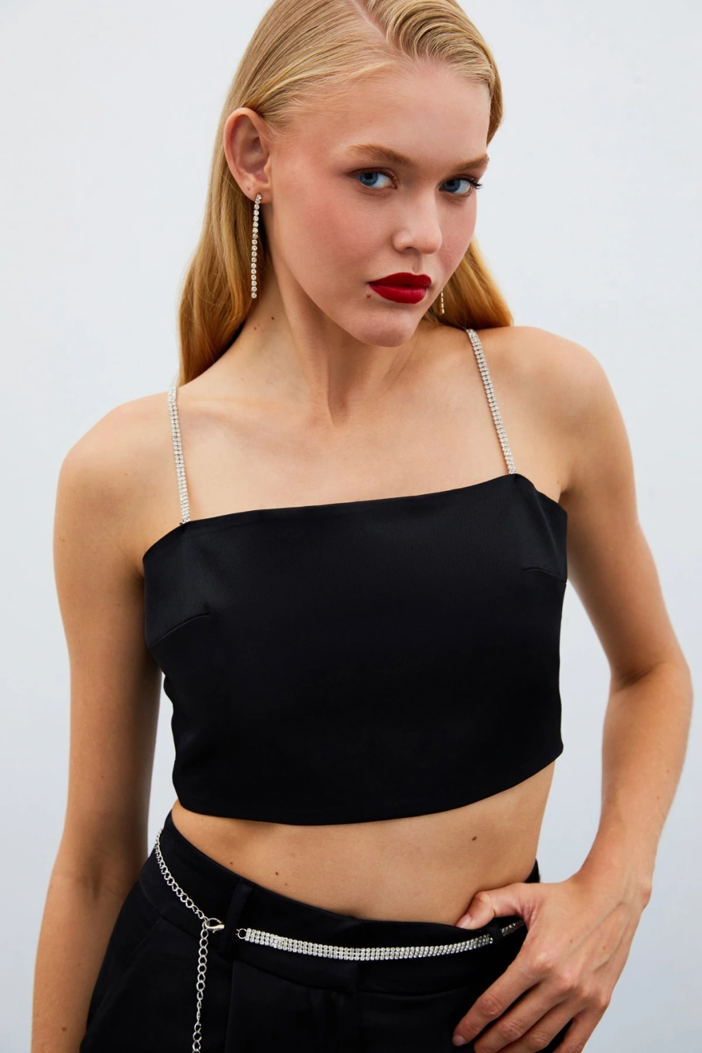 Taş Askılı Saten Crop Bluz - SİYAH
