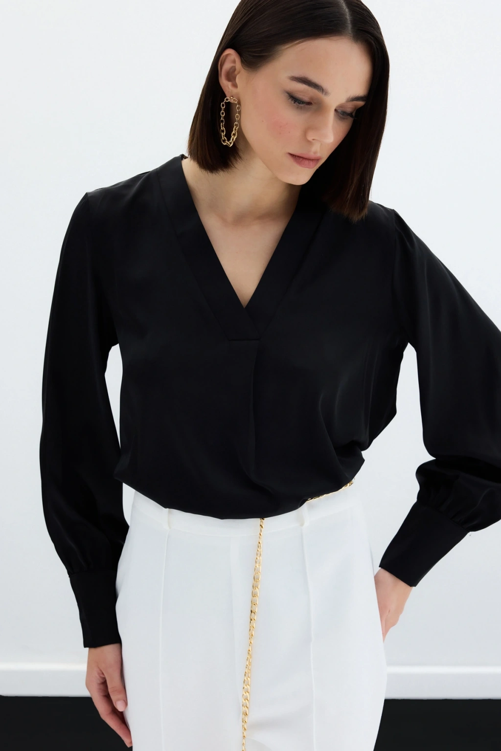 V Yaka Saten Bluz - Siyah