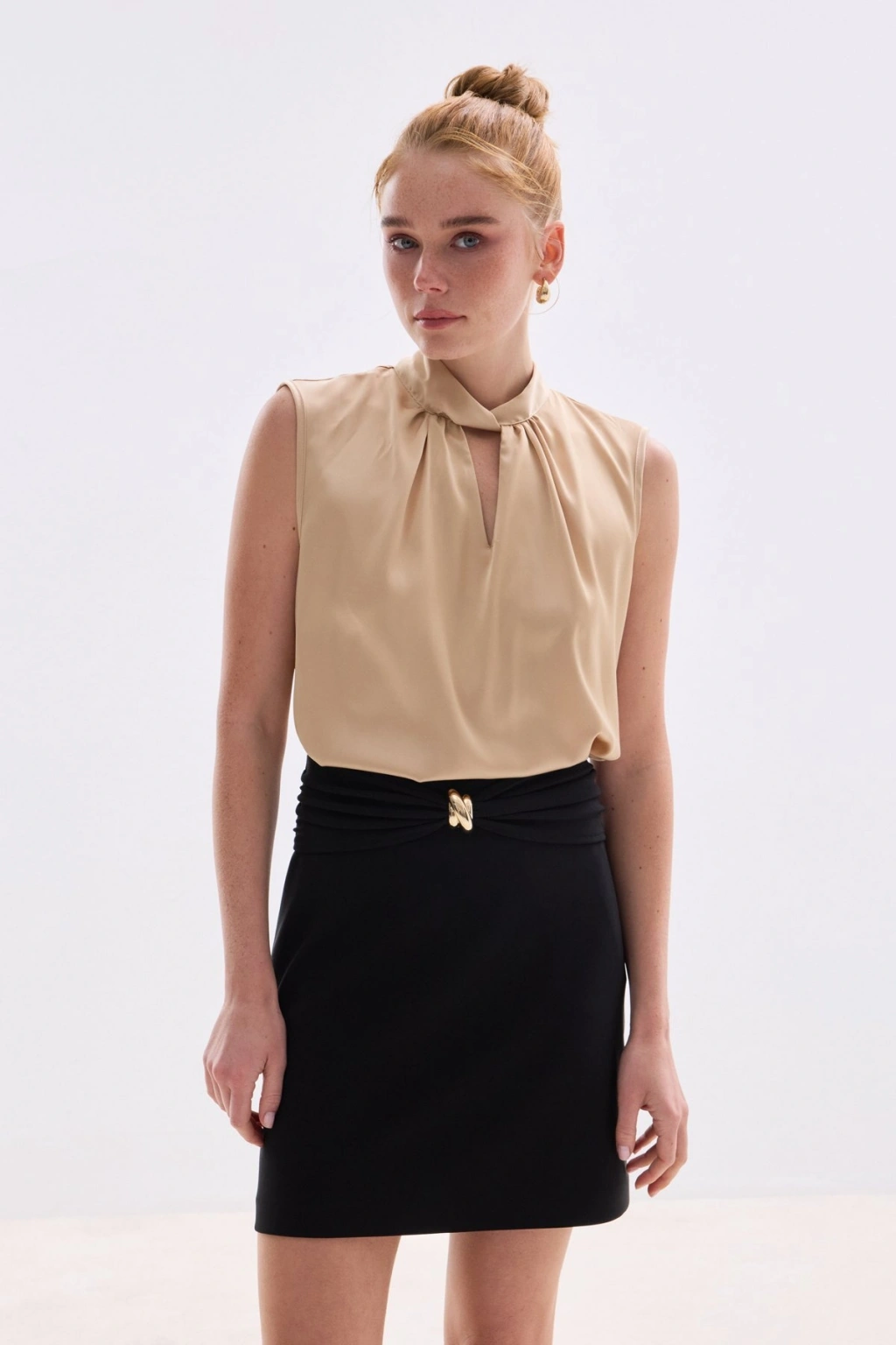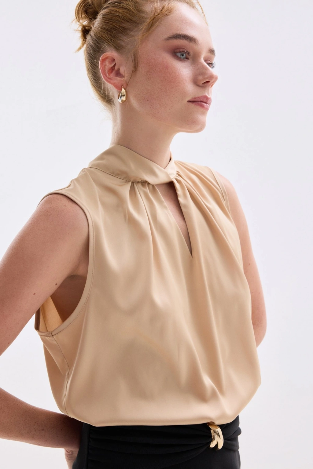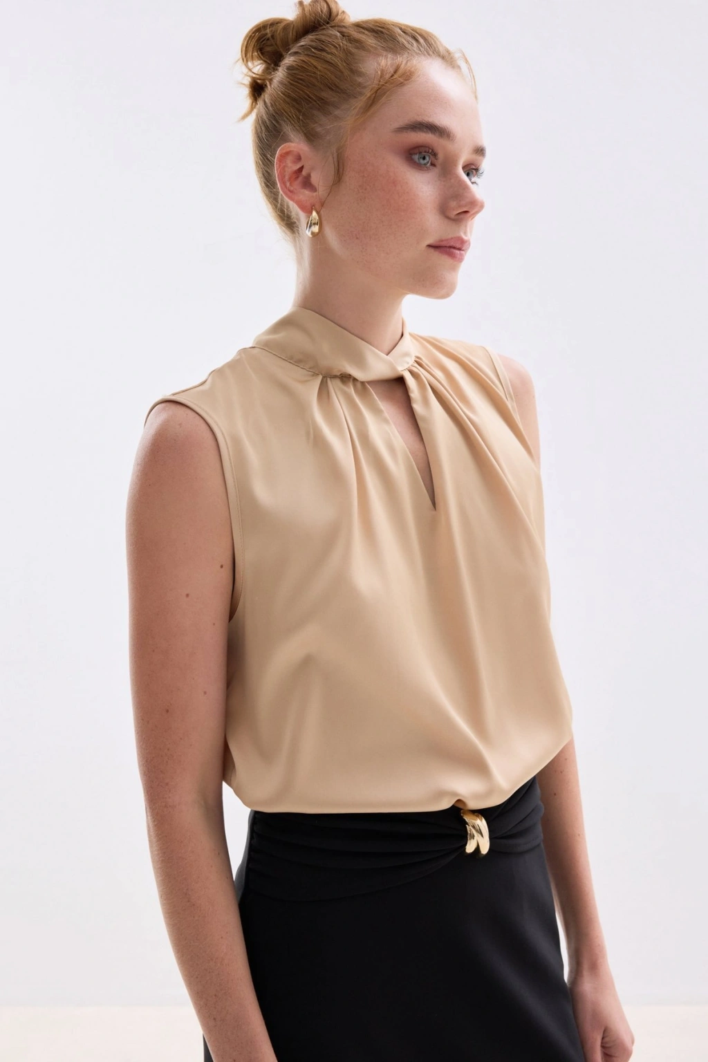 Boğazlı Kolsuz Bluz - Bej-Kahve