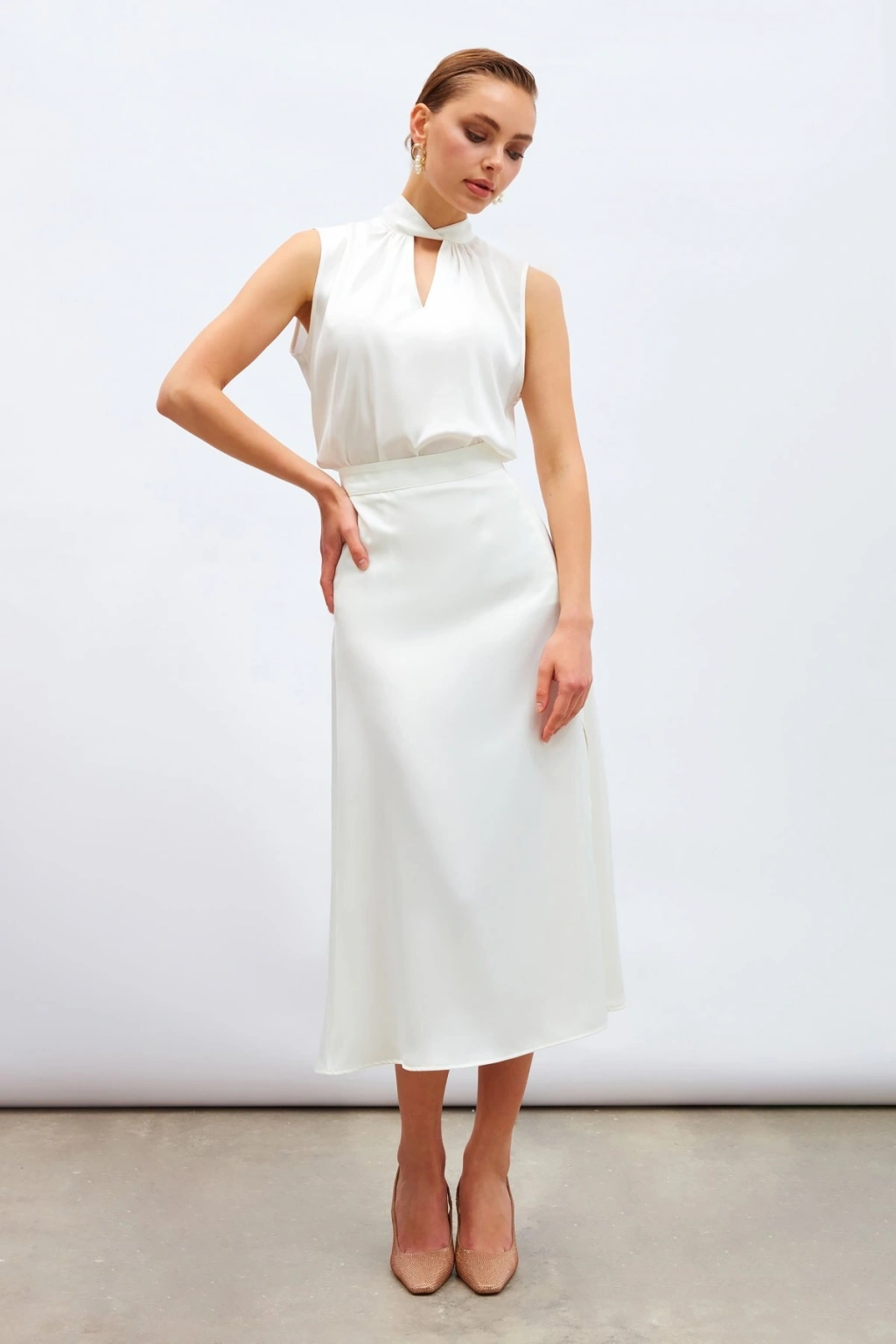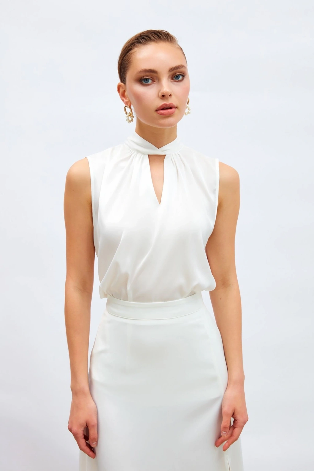 Yaka Detaylı Saten Bluz - Ekru