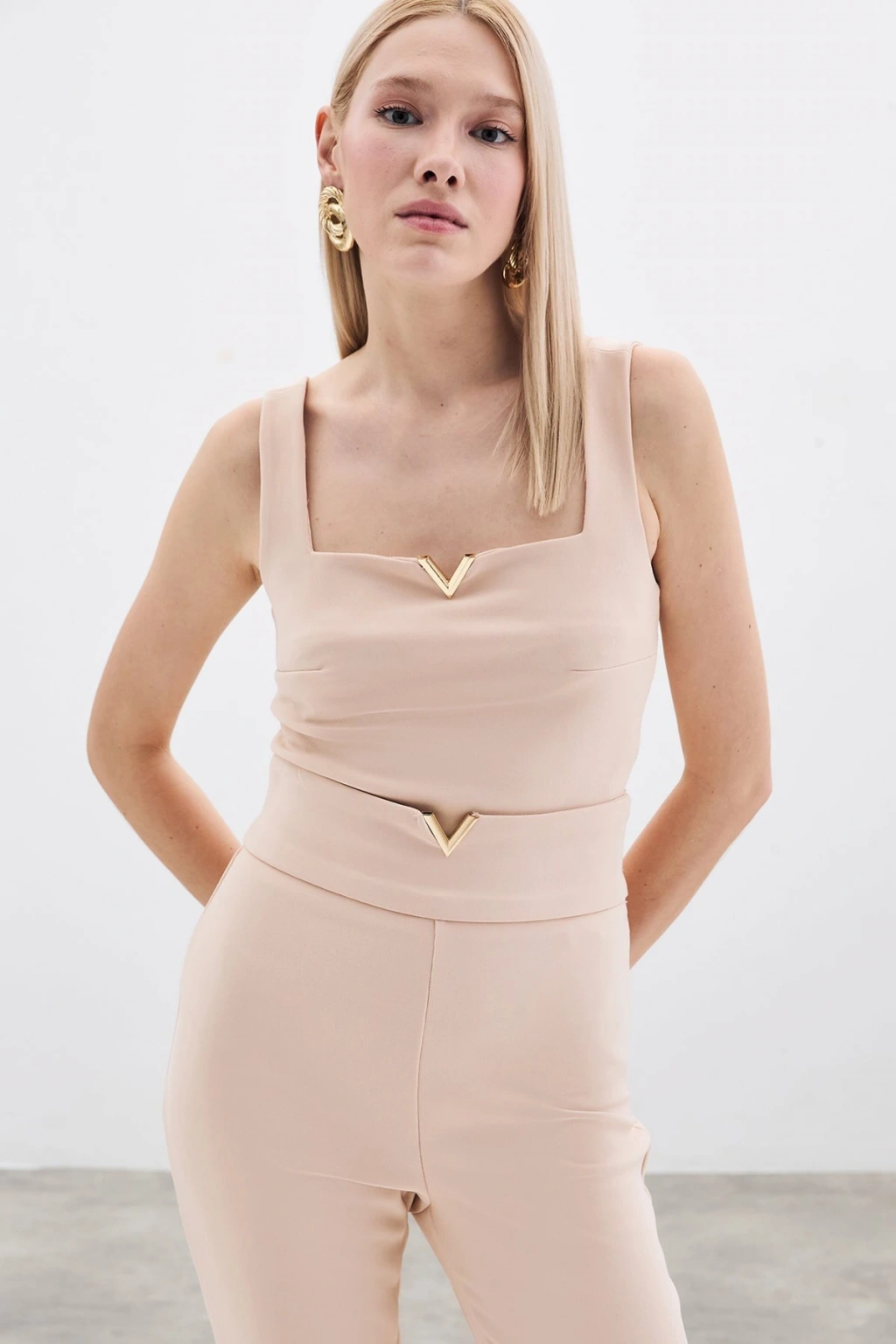 Yaka Gold Aksesuarlı Bluz - Bej