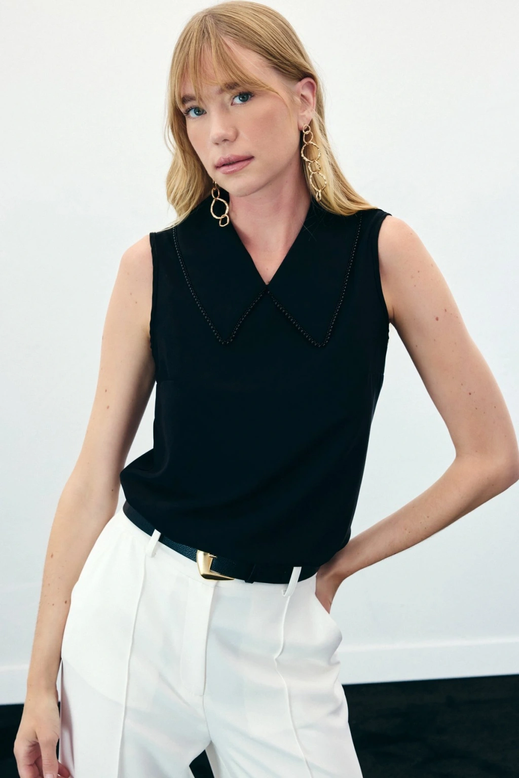 Yaka İncili Kolsuz Bluz - Siyah