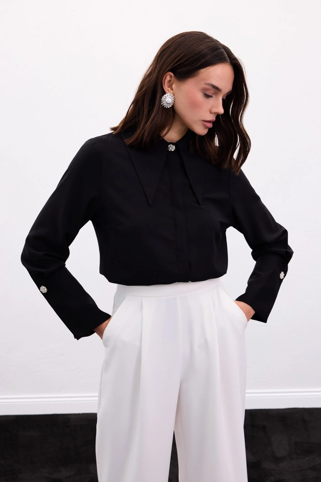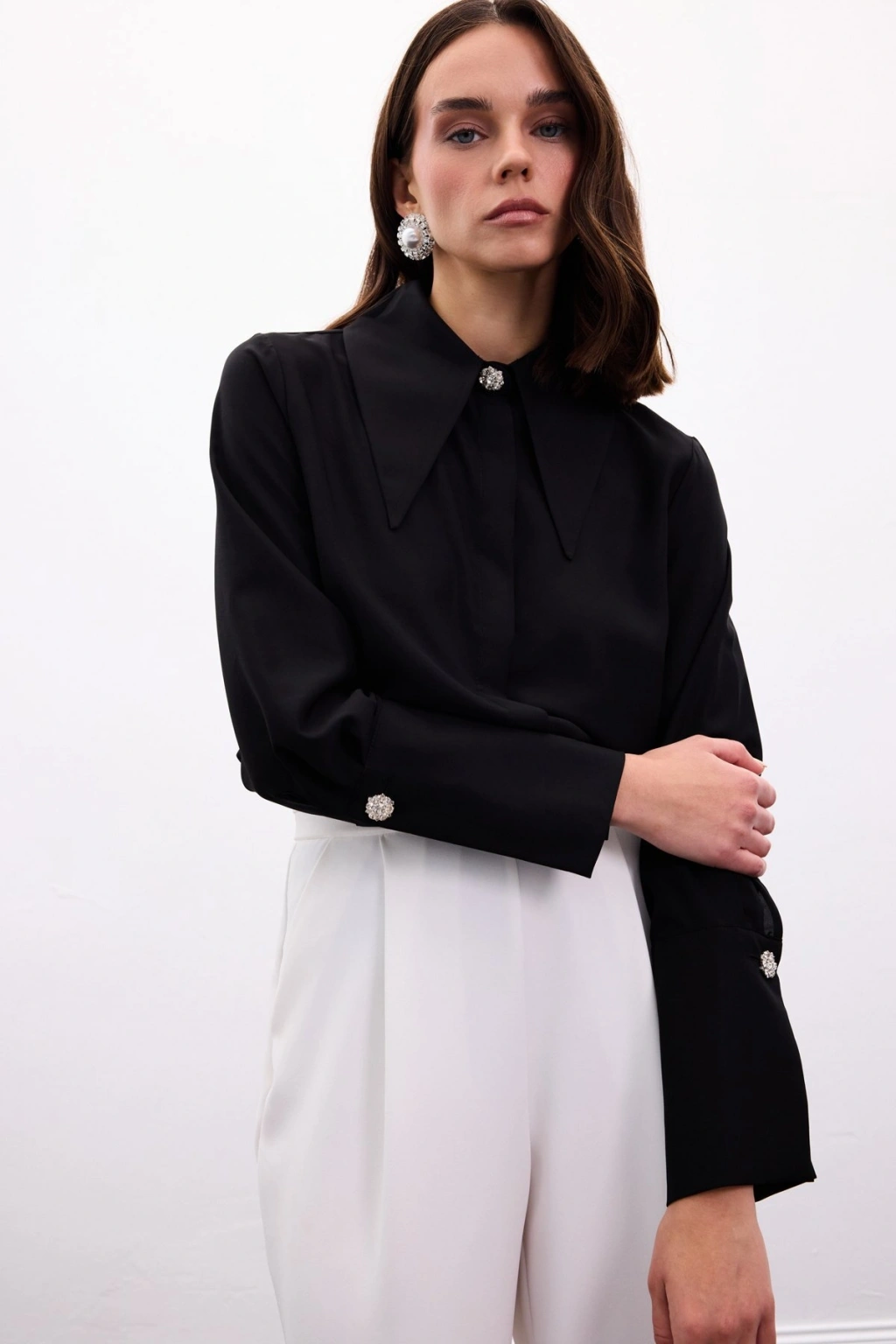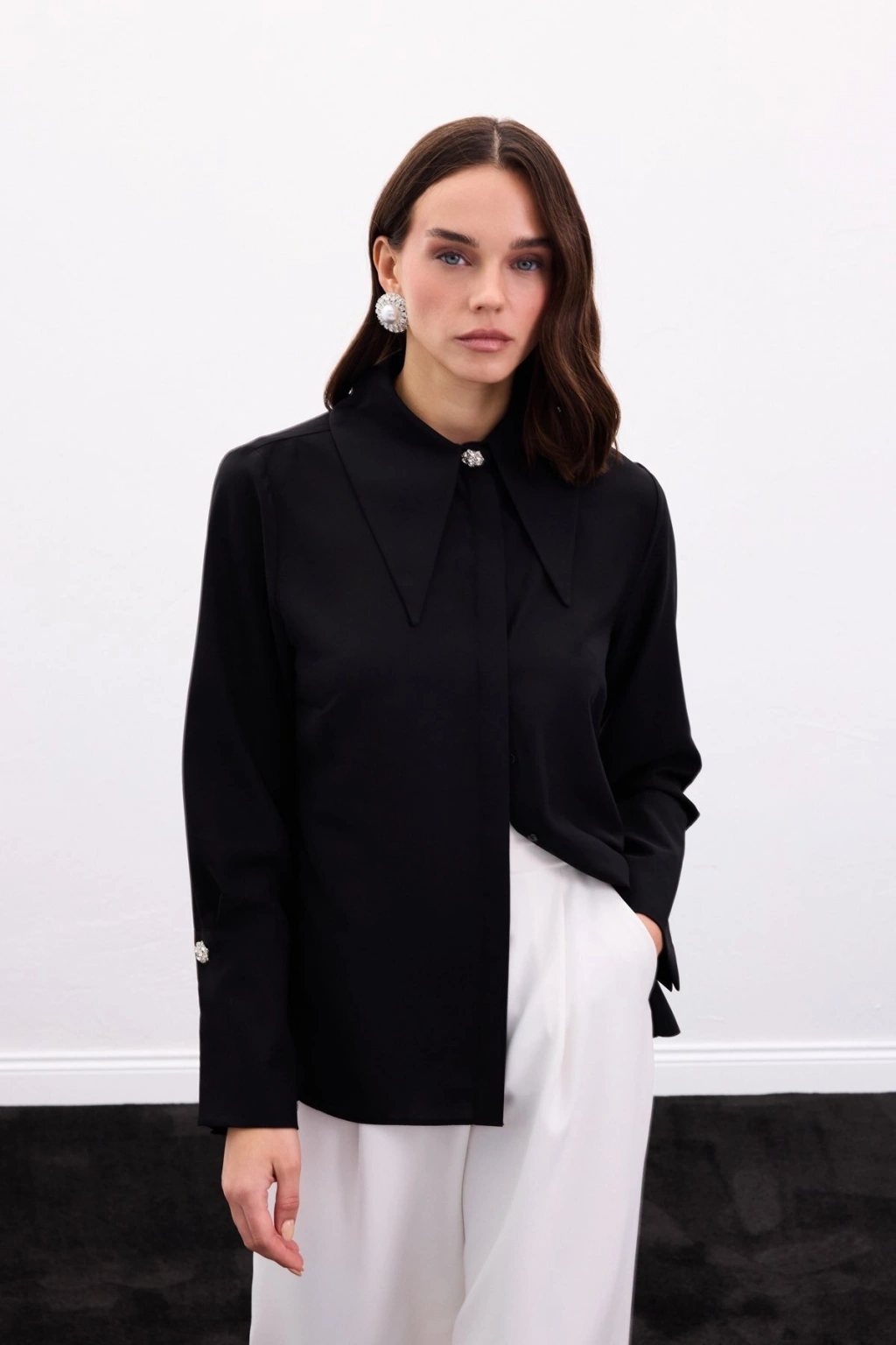 Yaka Ve Manşet Aksesuarlı Gömlek - Siyah