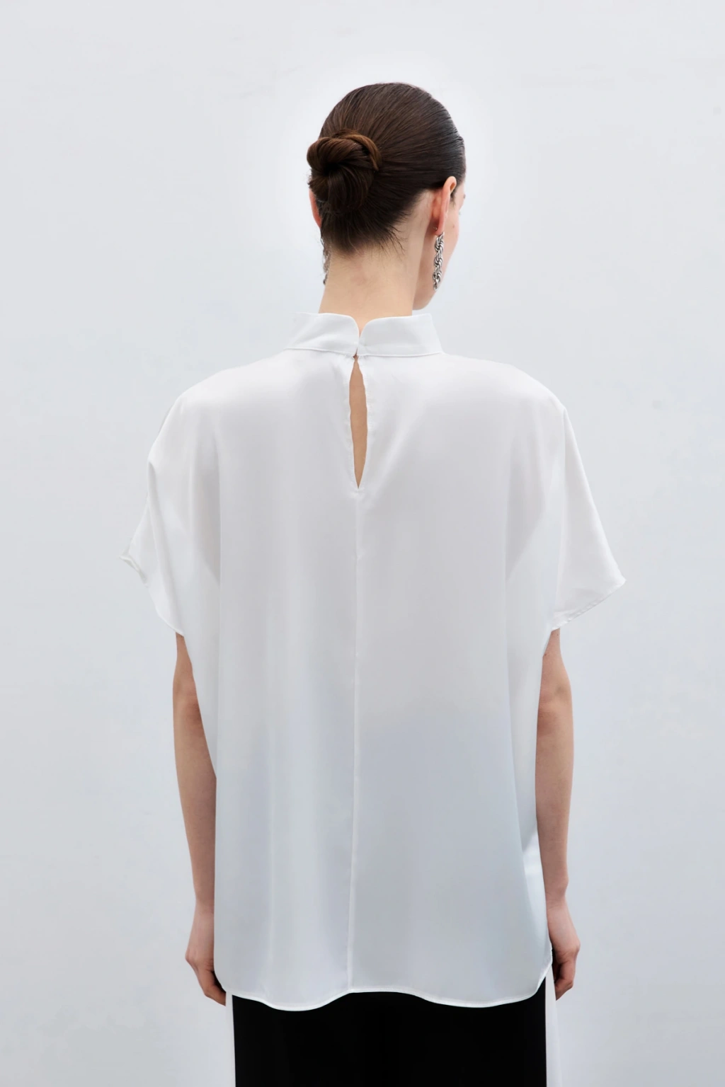 Dik Yaka Şifon Kol Detaylı Bluz - Bej