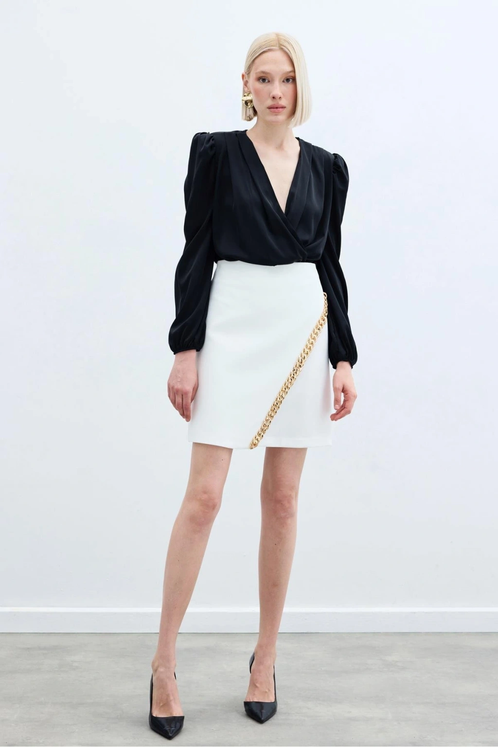 Zincir Aksesuarlı Mini Etek - Ekru